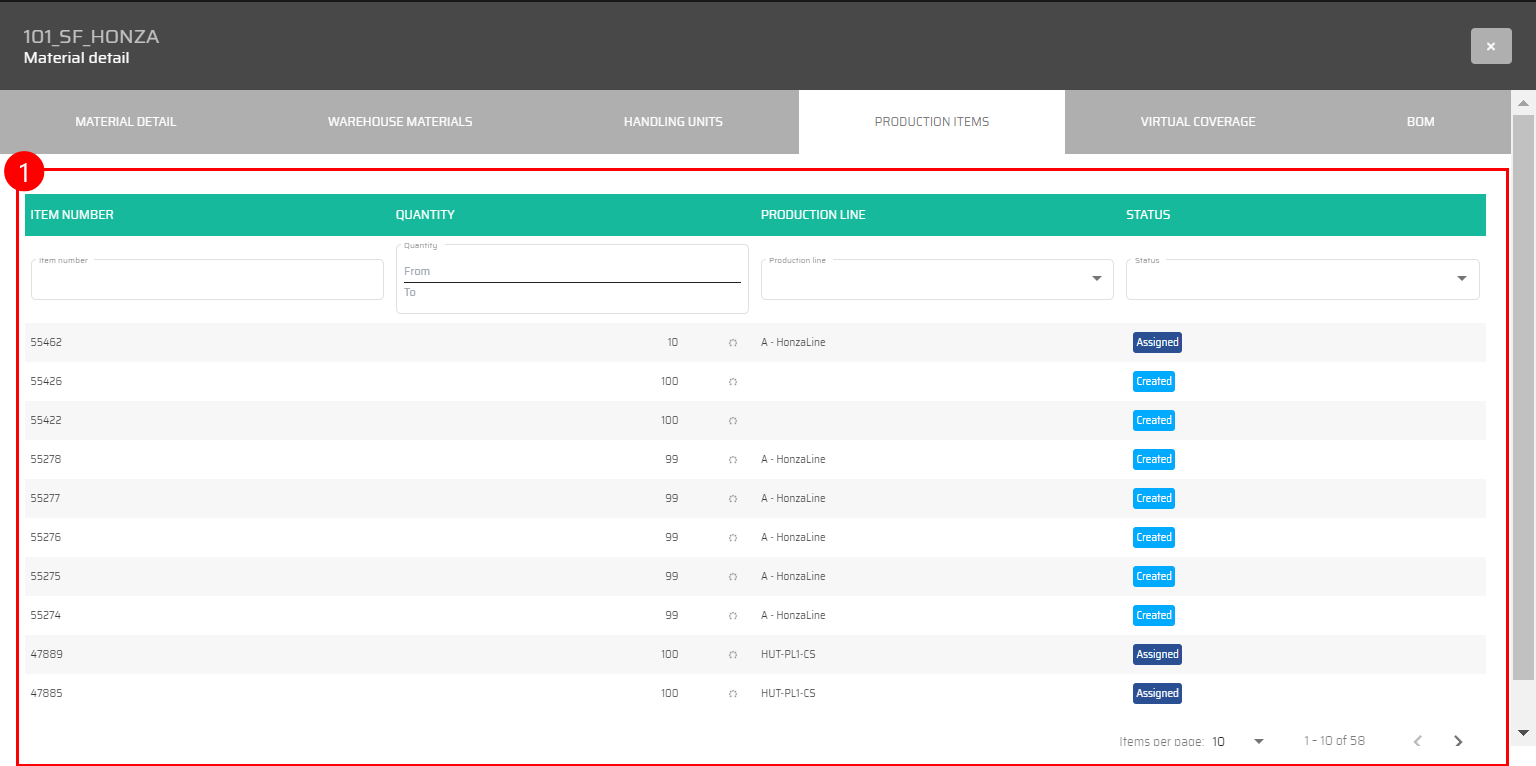 The list of all materials can be filtered by all shown columns, which means by:
