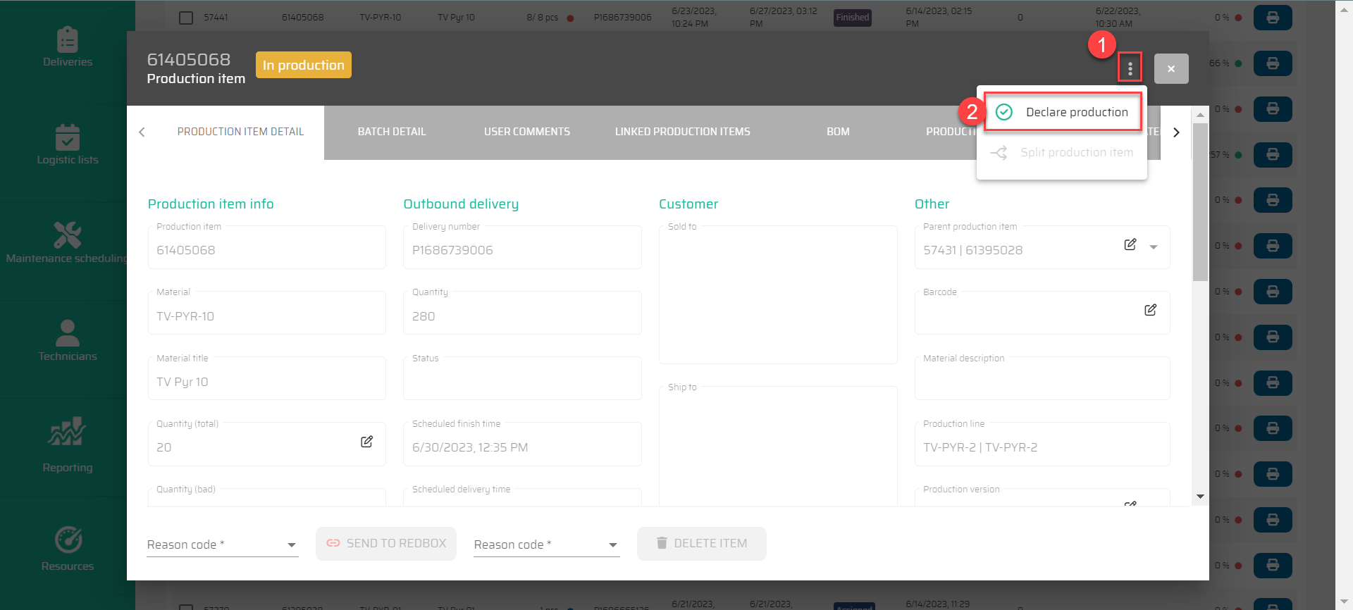 17. Parent production item 18. Handling unit template = how the material should be packed. 19. Barcode = barcode field. 20. Material description 21. Production line = on which we distributed the material 22. Production version 23. User finished 24. Created = creation date 25. Send to Redbox 26. Delete item