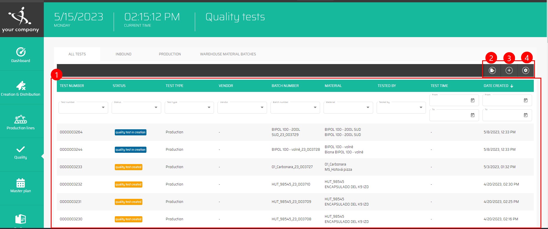 The list of all quality tests can be filtered by all shown columns, which means by: