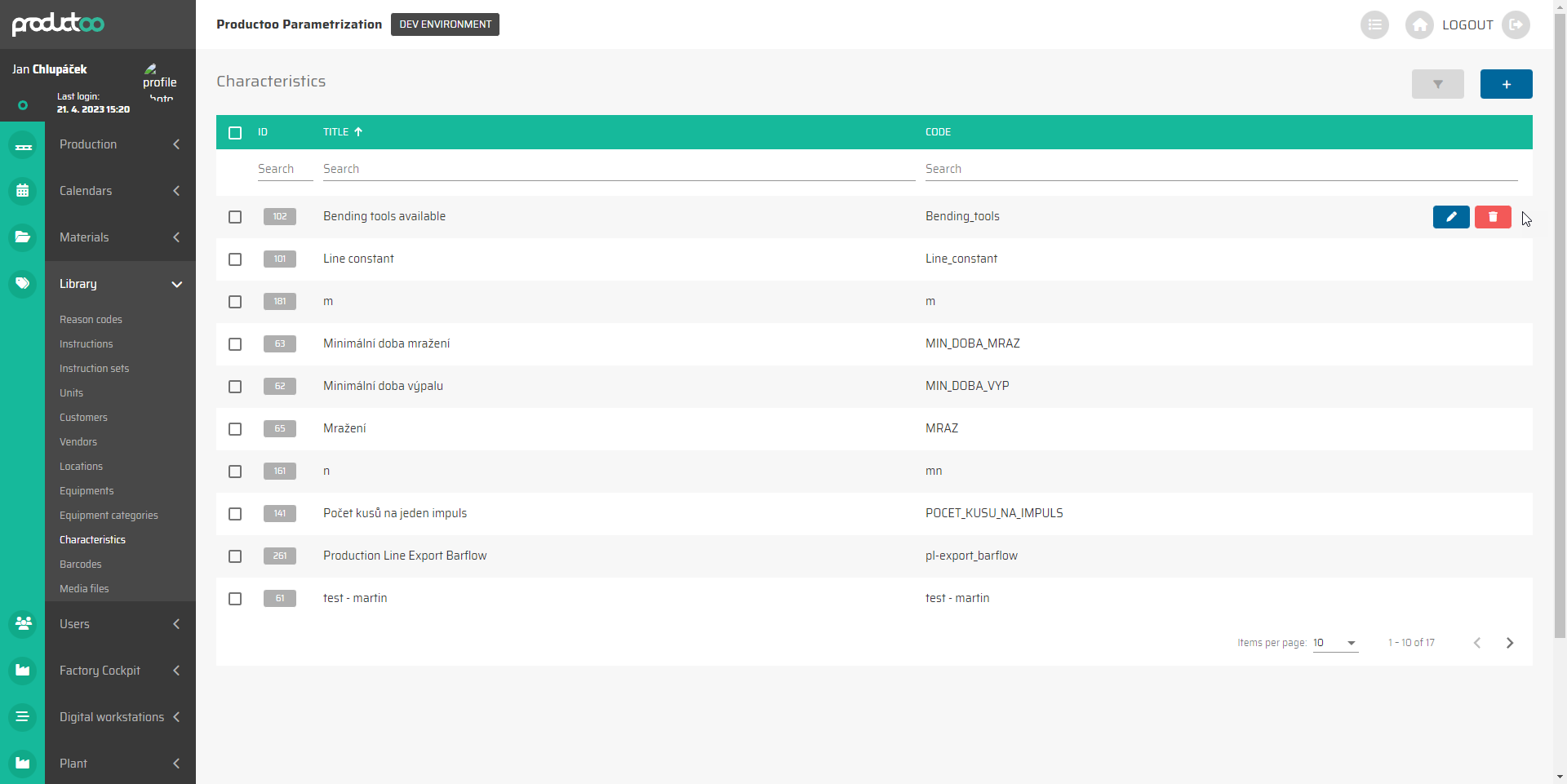 Tato karta zobrazuje všechny charakteristiky vytvořené v aplikaci P4 a umožňuje nám vytvářet, upravovat nebo mazat charakteristiky. Seznam Charakteristik lze filtrovat podle všech zobrazených sloupců, tedy podle: