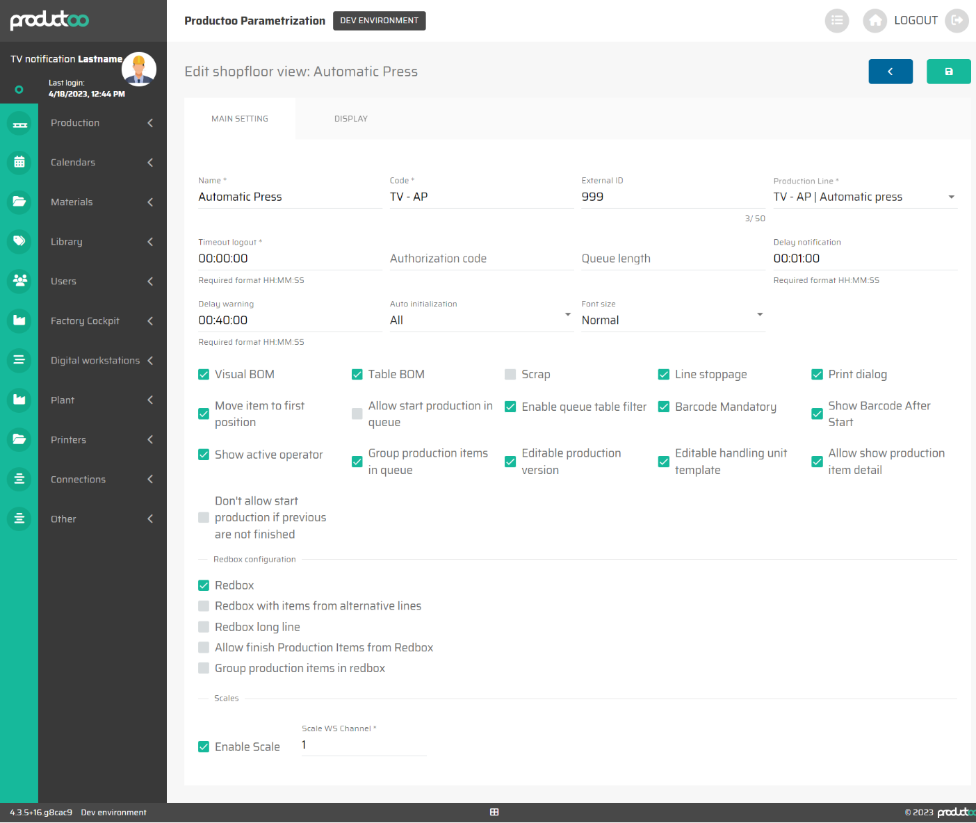 Redbox | checkbox | Zapnout / vypnout | Zobrazuje záložku s Redbox. Tato záložka obsahuje výrobní položky, které byly z této konkrétní výrobní linky odeslány do červené krabice. |