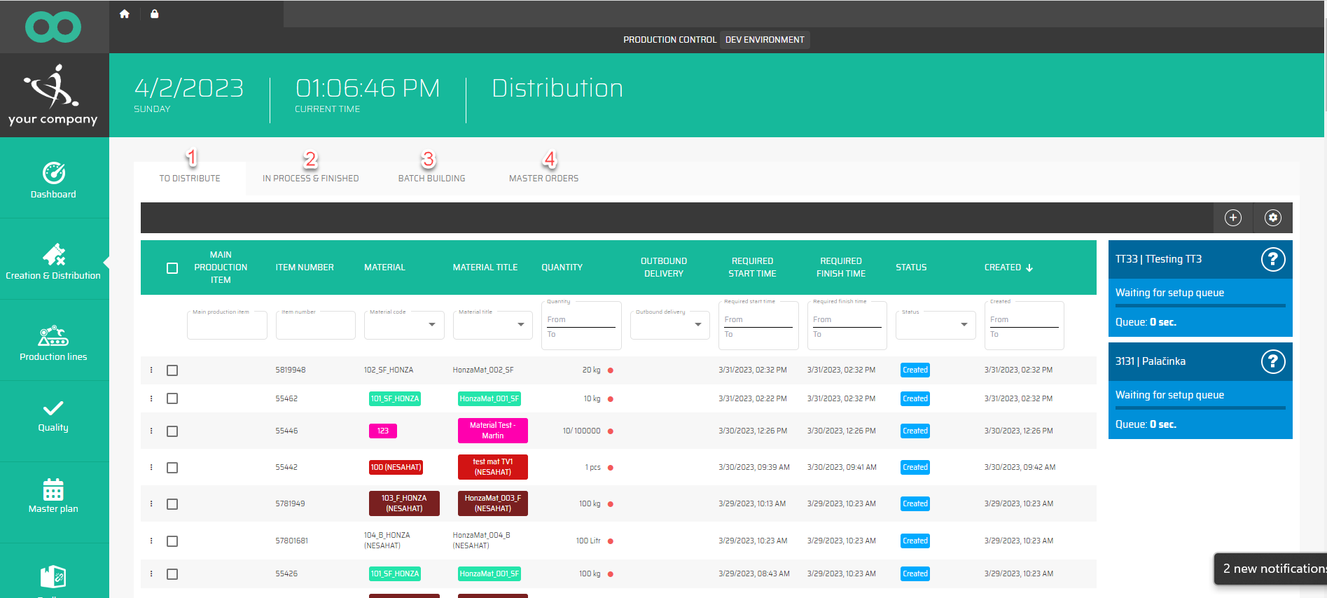 Levá sekce - obsahuje všechny výrobní položky ve stavu "Vytvořeno".