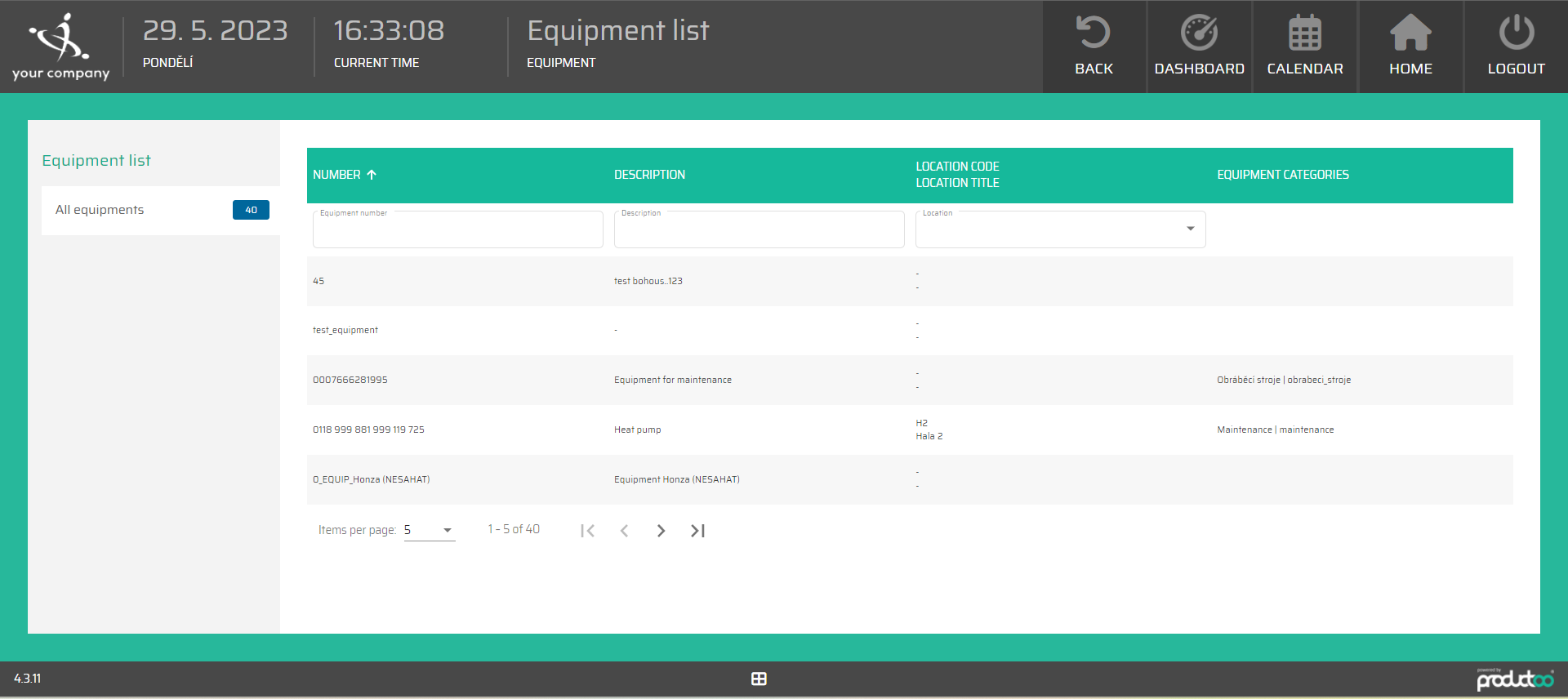 In the equipment section of the maintenance shopfloor view, we can find the list of equipment. This list can be sorted by following parameters: