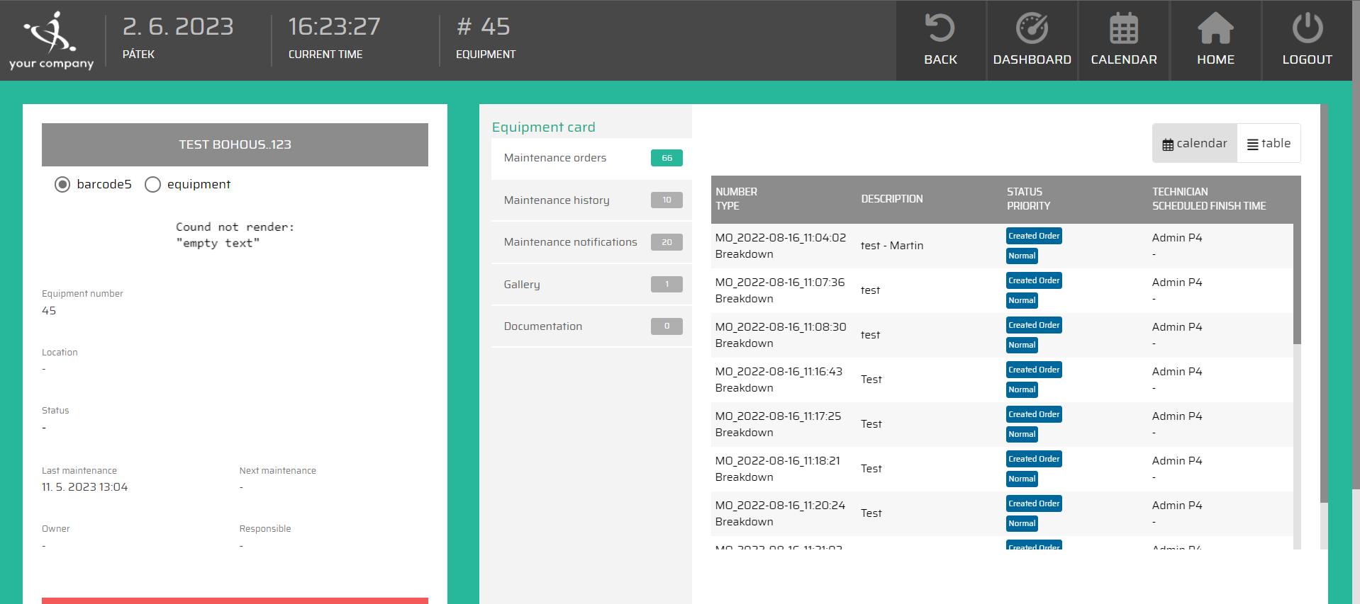 In the maintenance orders tab we can see the scheduled maintenance orders for the equipment. The records of them cna be view either by a calendar view or in the table.