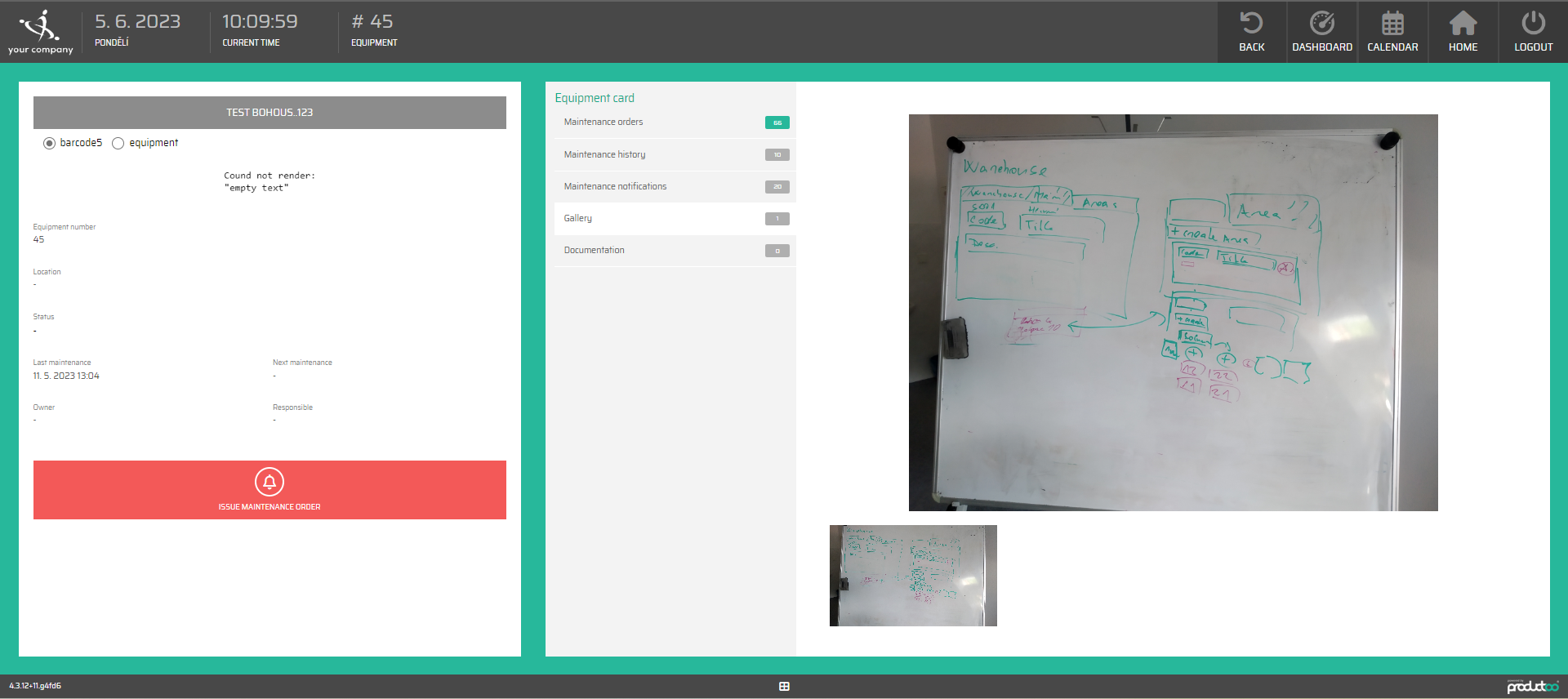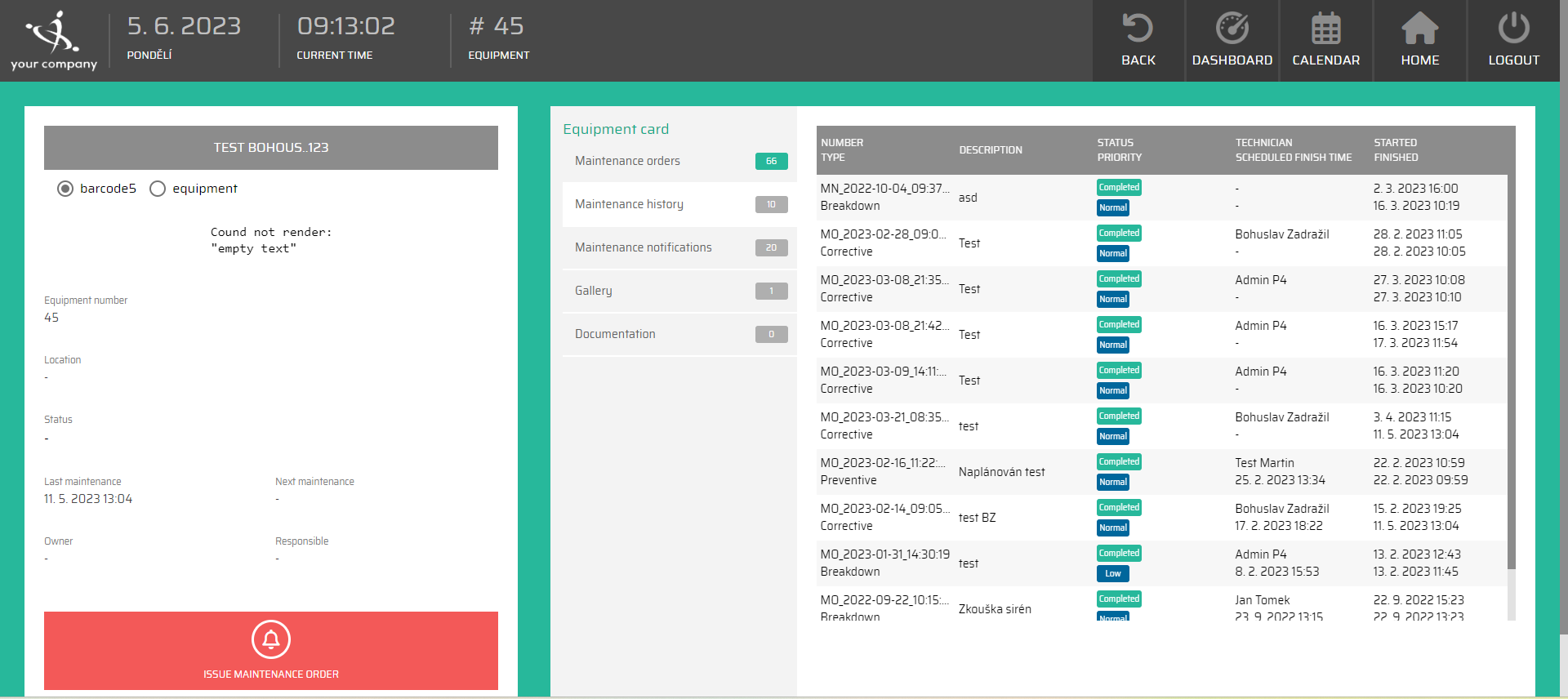 After selecting the equipment we will get to know more information. On the left side are the information about the equipment. With the button for issuing the maintenance order.