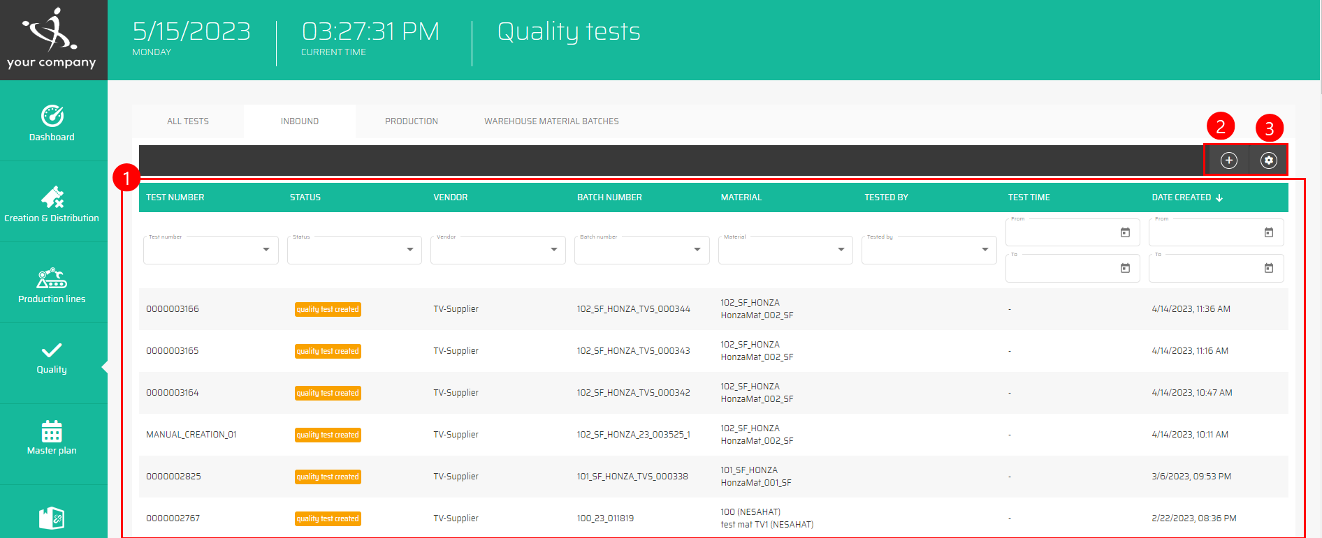 The list of all Inbound quality test can be filtered by all shown columns, which means by: