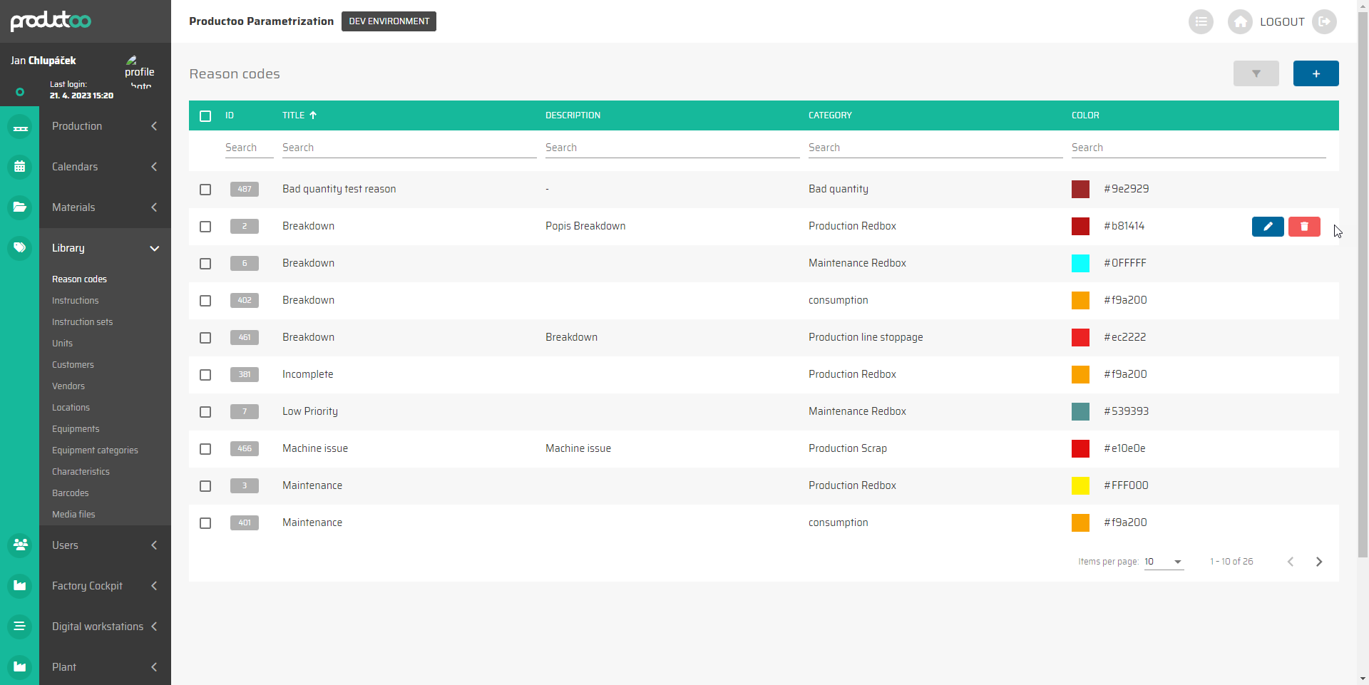 Tato karta zobrazuje všechny kódy příčiny vytvořené v aplikaci P4 a umožňuje nám buď vytvářet, upravovat nebo mazat kódy příčiny. Seznam kódů příčiny lze filtrovat podle všech zobrazených sloupců, což znamená: