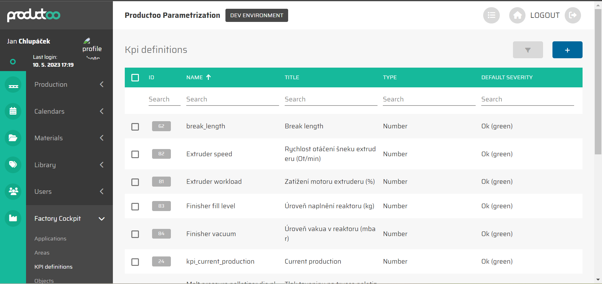 Tato karta zobrazuje všechny definice KPI vytvořené v aplikaci P4 a umožňuje nám vytvářet, upravovat nebo odstraňovat definice KPI. Seznam definic KPI lze filtrovat podle všech zobrazených sloupců, tedy podle: