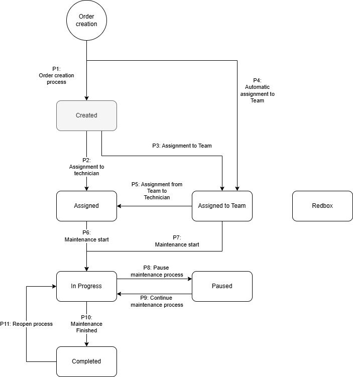 Created | When a maintenance order is initially created, it enters the "Created" status. | In this stage, the order contains essential details about the reported issue and awaits further action, such as assignment to Technician or Team |