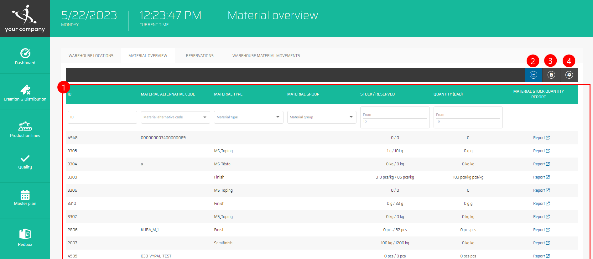 The list of all materials can be filtered by all shown columns, which means by: