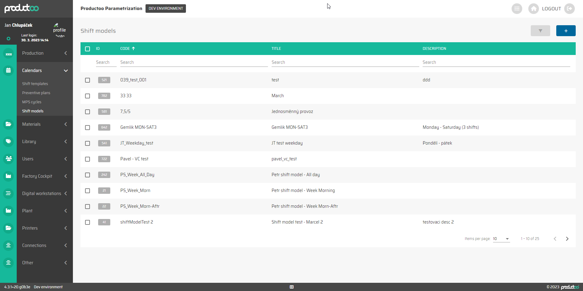 odstranit více modelů směn jejich výběrem (kliknutím na zaškrtávací políčko na začátku každého řádku) a poté kliknutím na tlačítko :delete:, které se objeví v pravém horním rohu