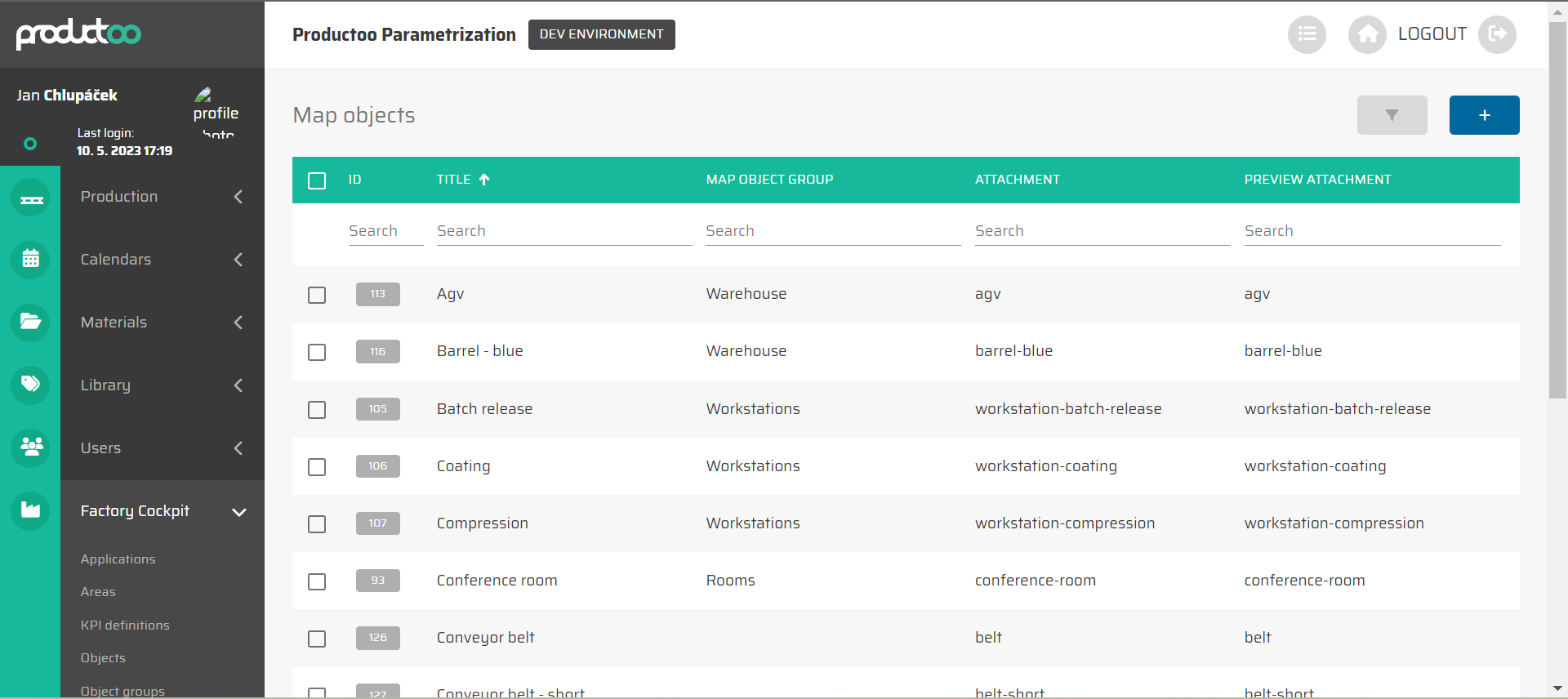 Tato karta zobrazuje všechny Objekty layoutu vytvořené v aplikaci P4 a umožňuje vytvářet, upravovat nebo odstraňovat Objekty layoutu. Seznam Objektů layoutu lze filtrovat podle všech zobrazených sloupců, tedy podle: