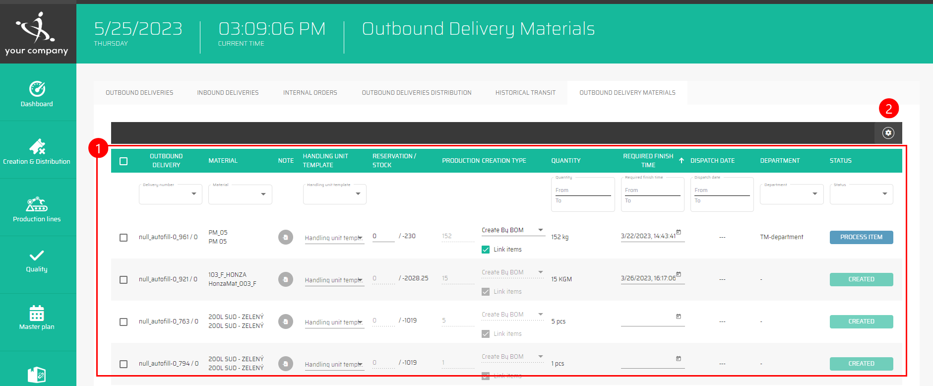 The list of all outbound delivery materials can be filtered by all shown columns, it means by: