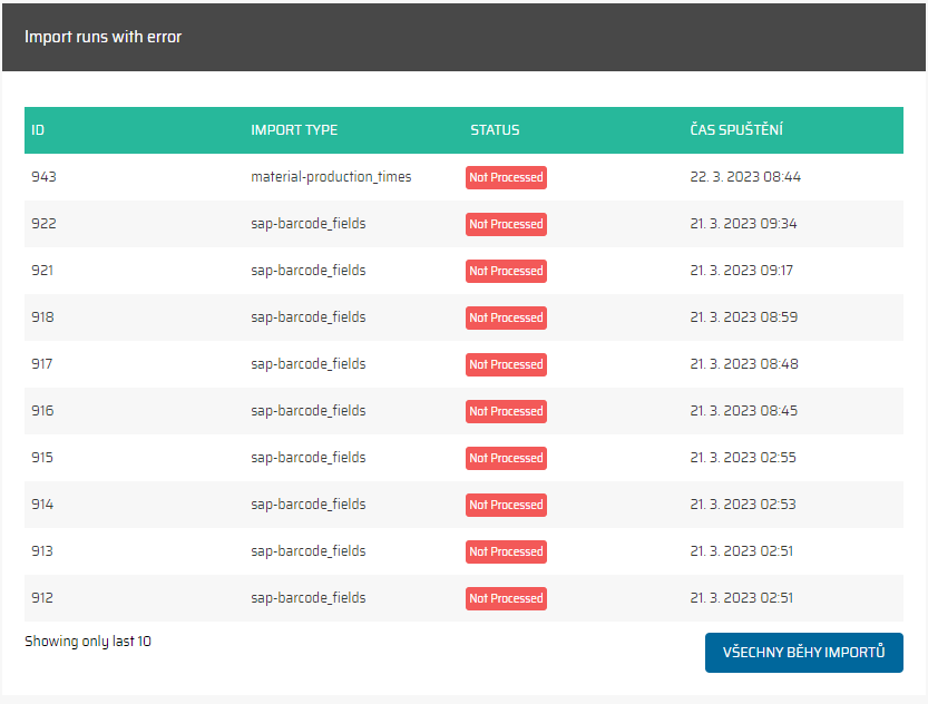 Identifikovat problémy: Pokud je počet "Zpracováno" výrazně nižší než počet "Celkem" pro konkrétní typ importu, může to naznačovat potenciální problémy nebo chyby v procesu importu, které vyžadují pozornost.