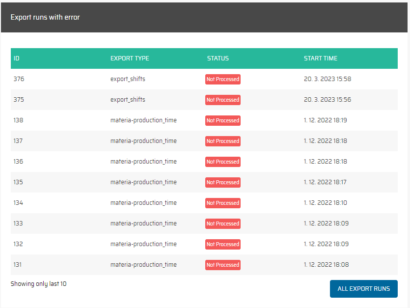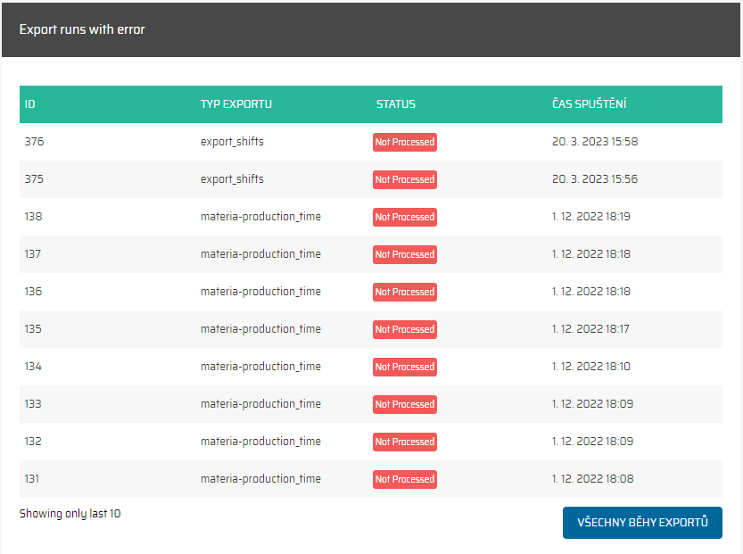 Celkem: Celkový počet ukazuje, kolikrát byl proces importu spuštěn celkově, bez ohledu na to, zda došlo k úspěšnému provedení nebo k výskytu chyb. Tato metrika poskytuje komplexní pohled na to, jak často byl proces importu spouštěn pro každý typ.