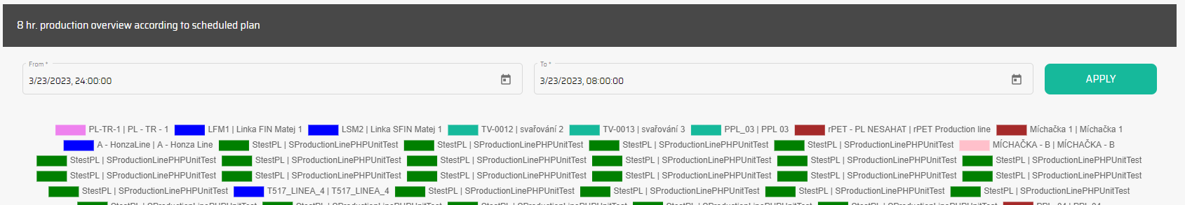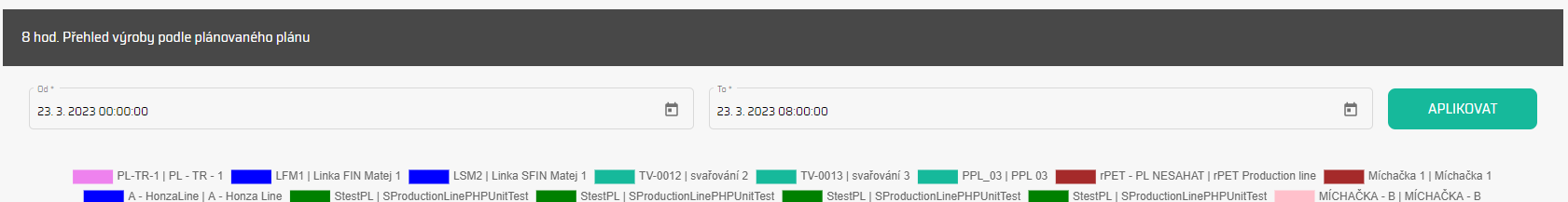 Před zobrazením dat můžete widget filtrovat podle konkrétní výrobní linky a časového období. Tímto způsobem získáte specifický pohled na výrobu, který vás zajímá.
