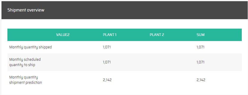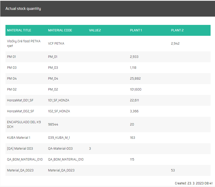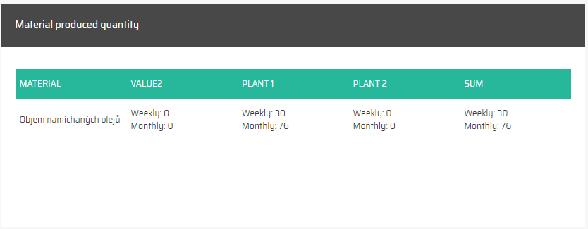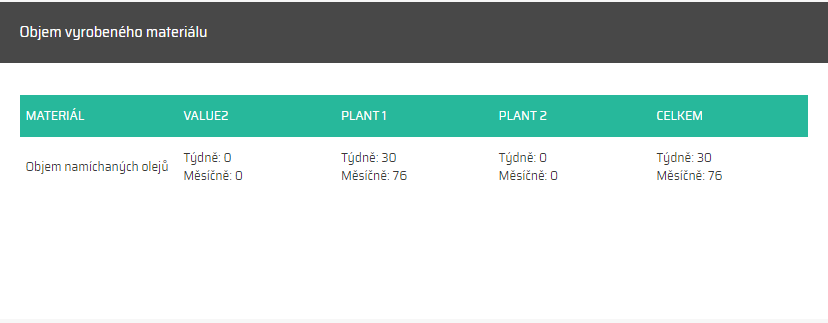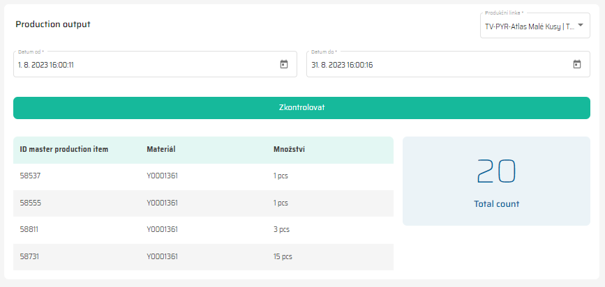 Jakmile zadáte požadované hodnoty filtru, widget vám zobrazí seznam master zakázek, které bylo díky výrobě na dané lince za dané období možné dokončit. To znamená, že widget nesleduje konkrétní výrobky, ale spíše master zakázky a množství materiálu potřebného k jejich dokončení.