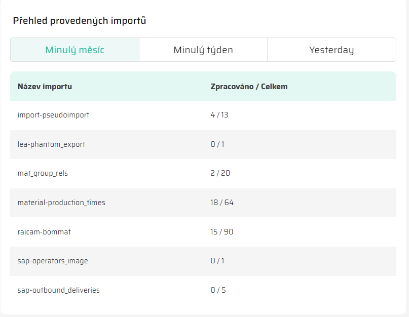 Sledovat spolehlivost importu: Porovnáním počtu "Zpracováno" a "Celkem" můžete hodnotit spolehlivost každého typu importu. Vyšší poměr "Zpracováno" k "Celkem" naznačuje úspěšnost a spolehlivost daného typu importu.