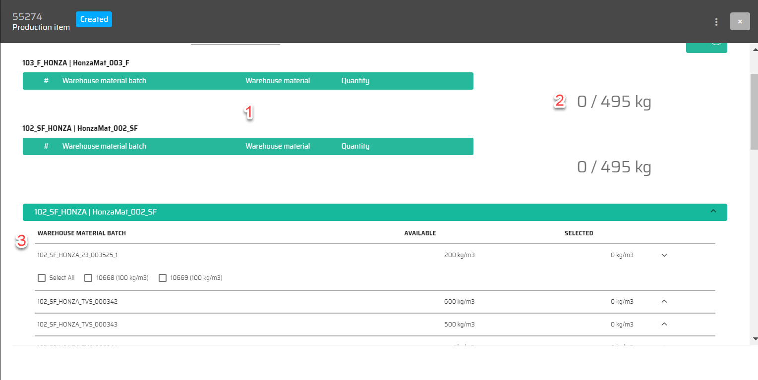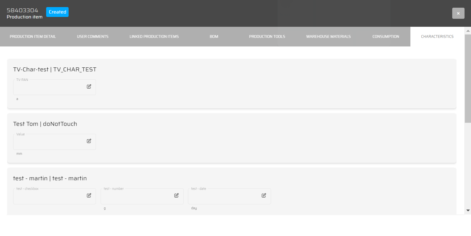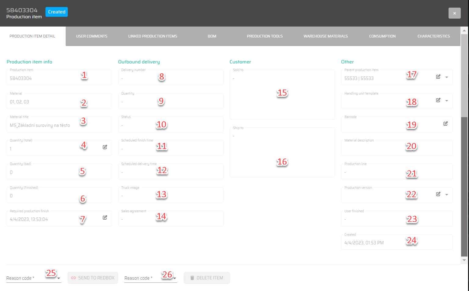 17. Parent production item 18. Handling unit template = how the material should be packed. 19. Barcode = barcode field. 20. Material description 21. Production line = on which we distributed the material 22. Production version 23. User finished 24. Created = creation date 25. Send to Redbox 26. Delete item
