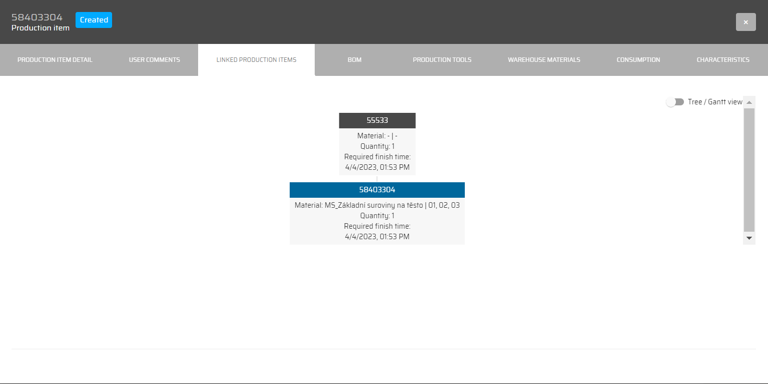 All properties of the Production Item are preserved, including the BOM. If this Production Item has linked sub-Production Items under it according to the BOM, these sub-items are also divided proportionally.