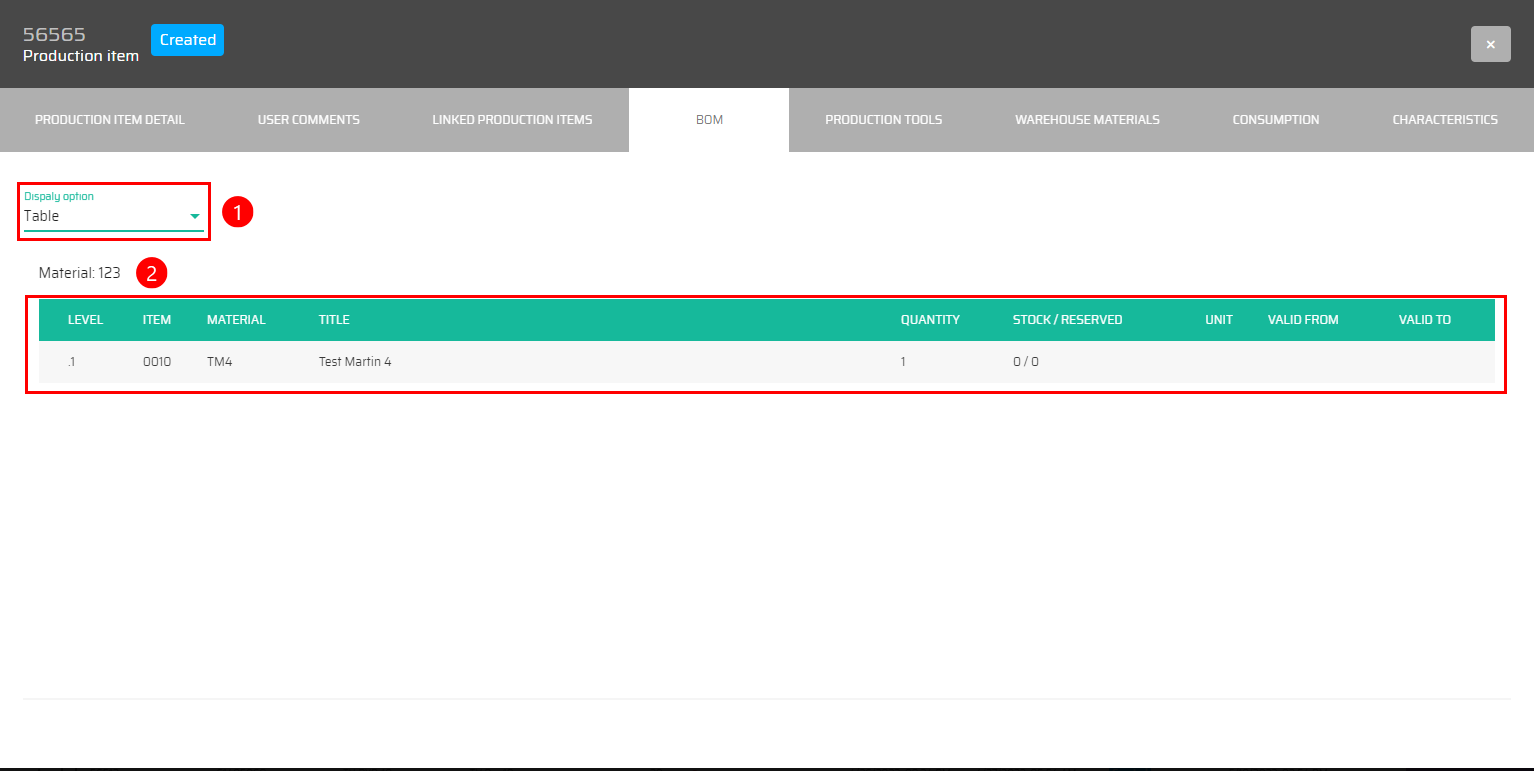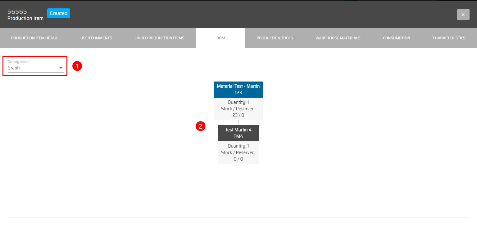 Na kartě BOM detailu výrobní položky můžeme tuto kartu zobrazit dvěma způsoby. Tyto možnosti můžeme vybrat v liště výběru "Možnost zobrazení" tím, že vybereme jednu z těchto dvou možností: