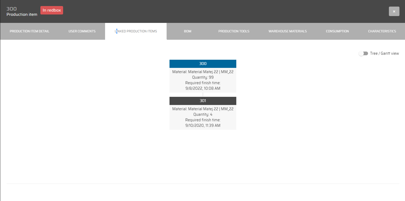 Informace o výrobní lince budou zobrazeny pouze tehdy, pokud byla položka odeslána z této linky.