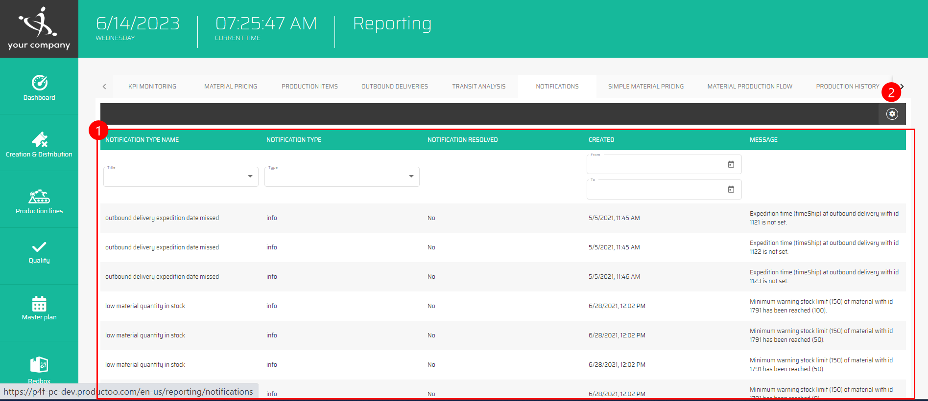 Seznam Notifikací může být filtrován podle všech zobrazených sloupců, tedy: