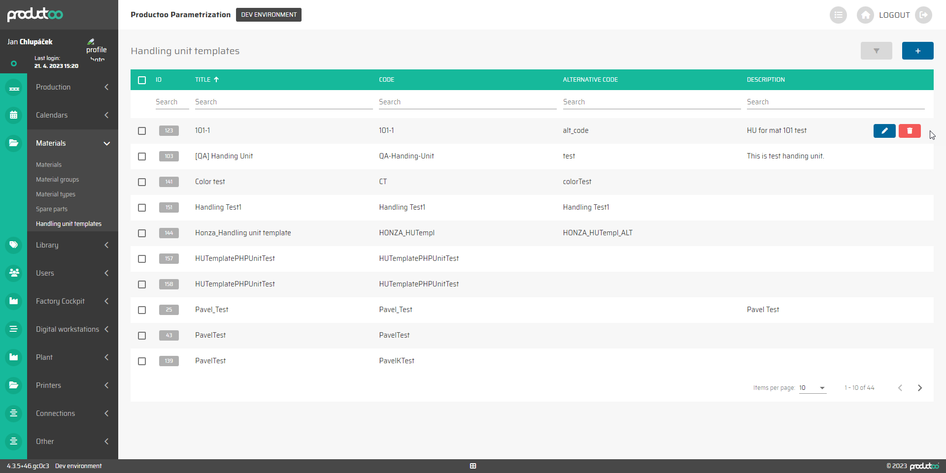 Tato záložka zobrazuje všechny vytvořené šablony manipulačních jednotek v rámci aplikace P4 a umožňuje nám je vytvářet, upravovat nebo mazat. Seznam šablon manipulačních jednotek lze filtrovat podle všech zobrazených sloupců, což znamená podle: