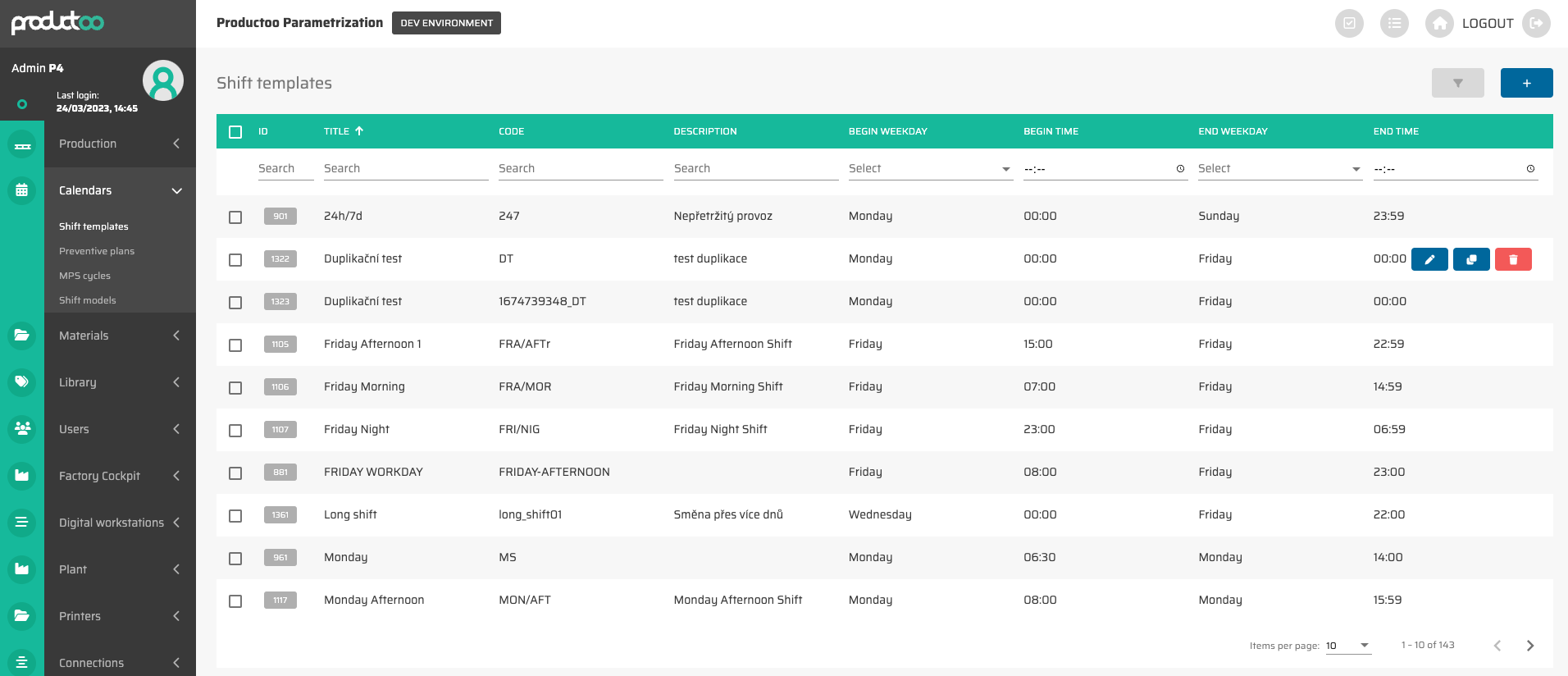 Tato obrazovka zobrazuje všechny šablony směn v aplikaci P4 a umožňuje nám vytvářet, upravovat, mazat nebo kopírovat šablony směn. Seznam šablon směn lze filtrovat podle všech zobrazených sloupců, tj.