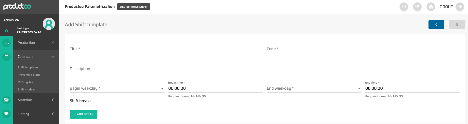 Šablony směn jsou základní entity používané k nastavení výrobního plánu. Představují plán konkrétní směny během týdne a lze je přiřadit k více výrobním linkám a vygenerovat konkrétní směnu na základě šablony.
