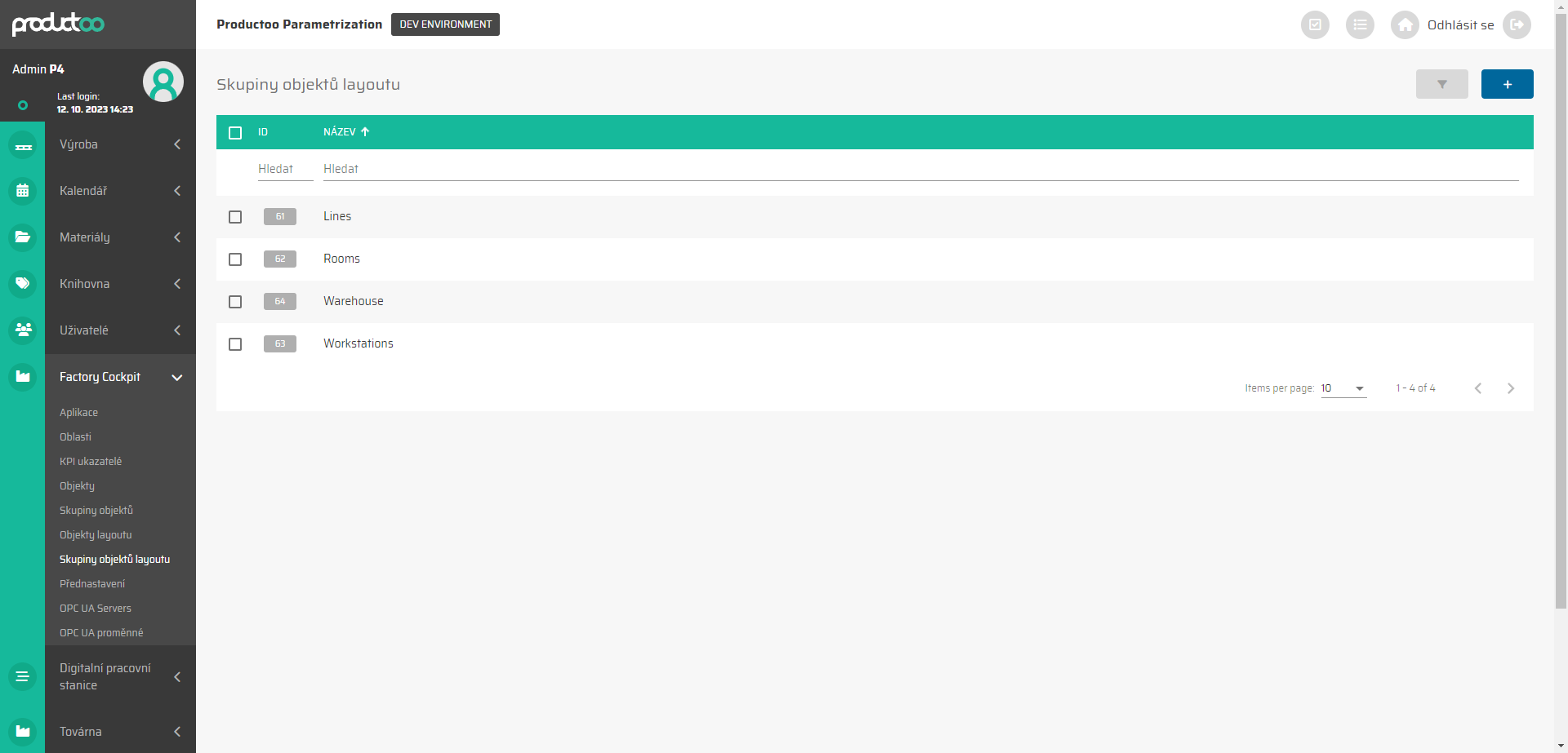 Tato karta zobrazuje všechny skupiny objektů layoutu vytvořené v aplikaci P4 a umožňuje nám vytvářet, upravovat nebo odstraňovat skupiny objektů layoutu. Seznam skupin objektů layoutu lze filtrovat podle všech zobrazených sloupců, tedy podle: