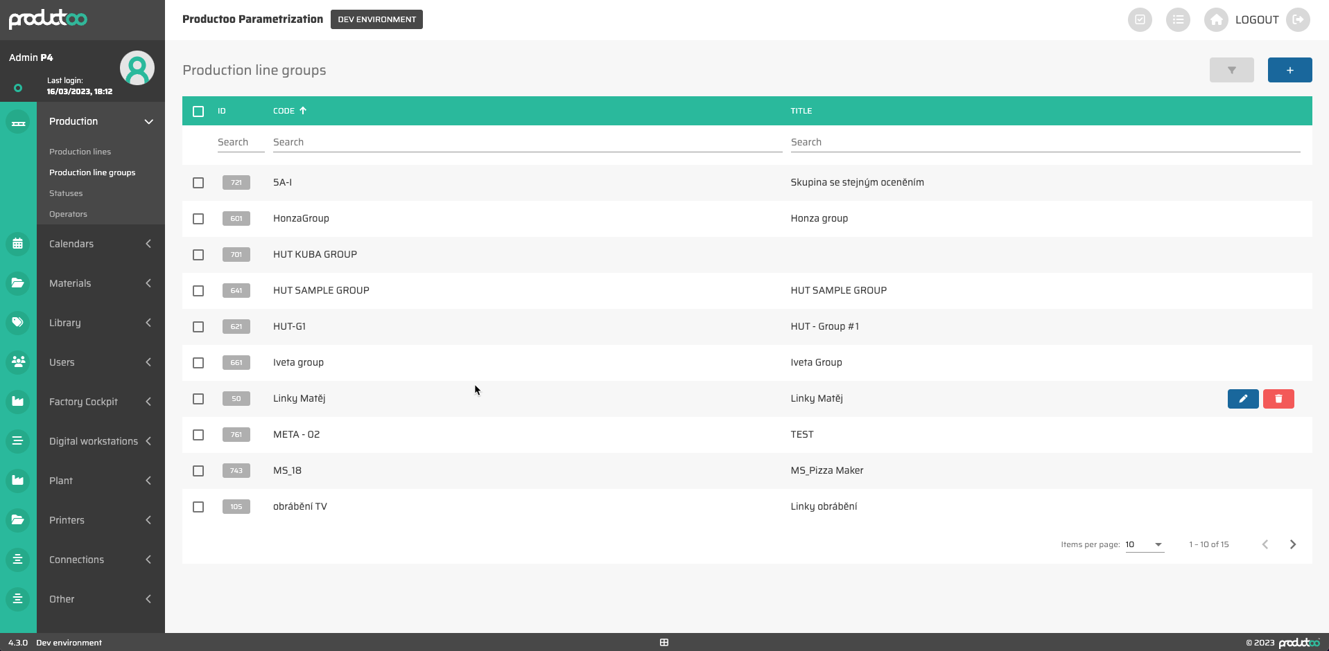 Skupiny výrobních linek slouží ke zjednodušení filtrování a třídění výrobních linek v systému (například v přehledu výrobních linek v programu Řízení výroby). Tato záložka zobrazuje všechny skupiny výrobních linek v rámci aplikace P4 a umožňuje nám buď vytvořit, upravit, nebo odstranit skupinu výrobních linek. Seznam výrobních linek lze filtrovat podle všech zobrazených sloupců, tzn. podle: