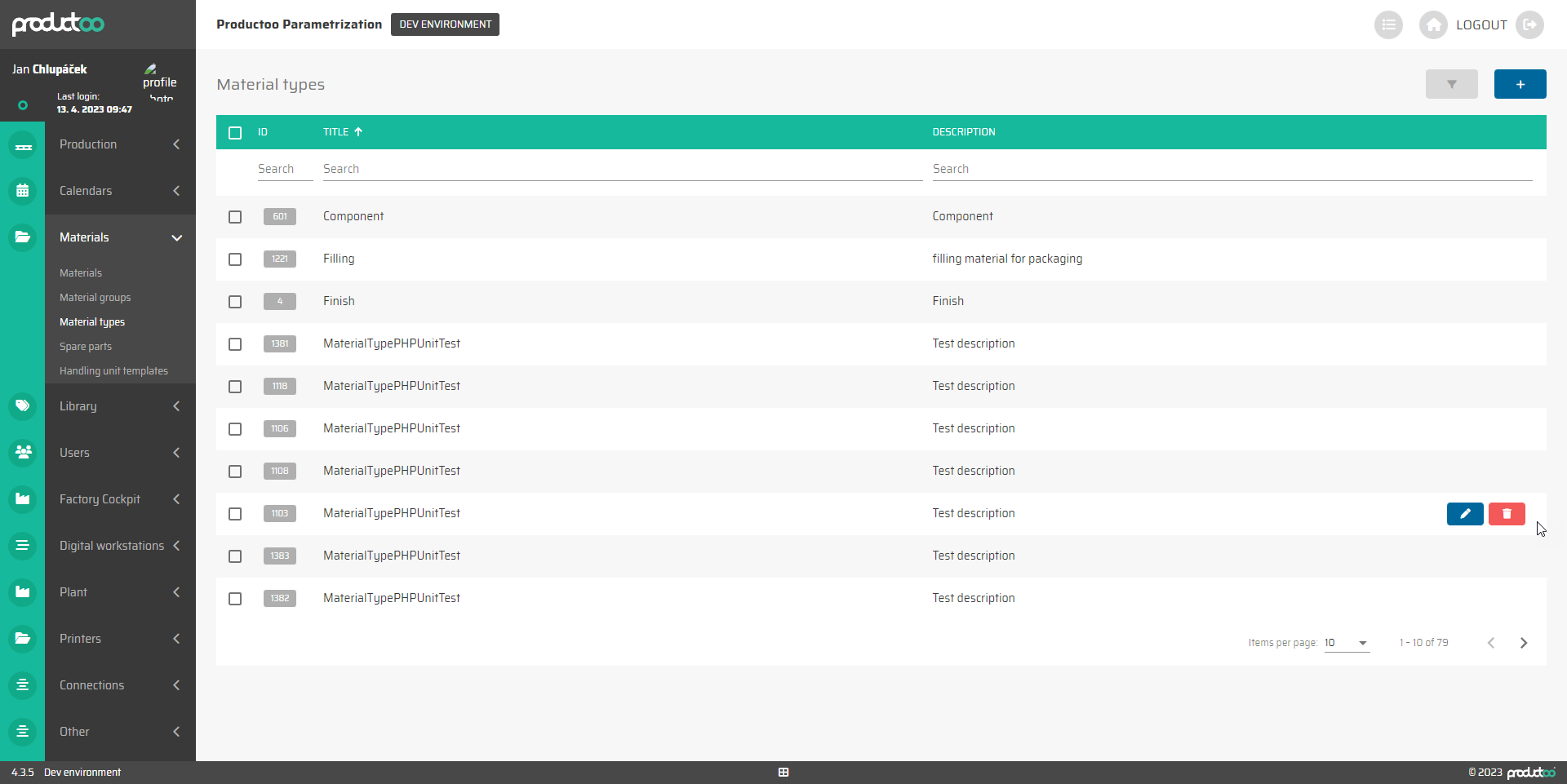 Tato záložka zobrazuje všechny typy materiálů vytvořené v rámci aplikace P4 a umožňuje nám vytvářet, upravovat nebo mazat typy materiálů. Seznam typů materiálů lze filtrovat podle všech zobrazených sloupců, což znamená podle: