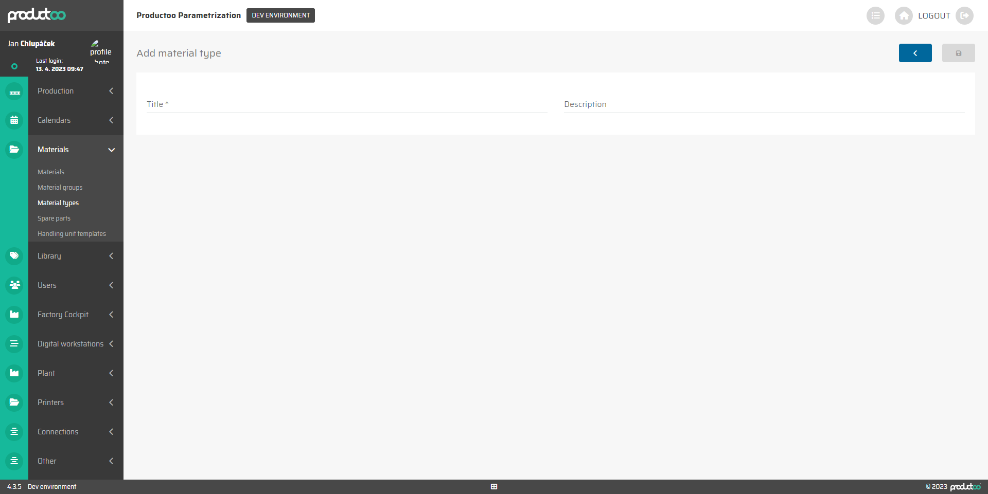 Na obrazovce s podrobnostmi o typech materiálů můžeme upravit již vytvořený typ materiálu nebo vyplnit všechny informace potřebné k vytvoření nového.
