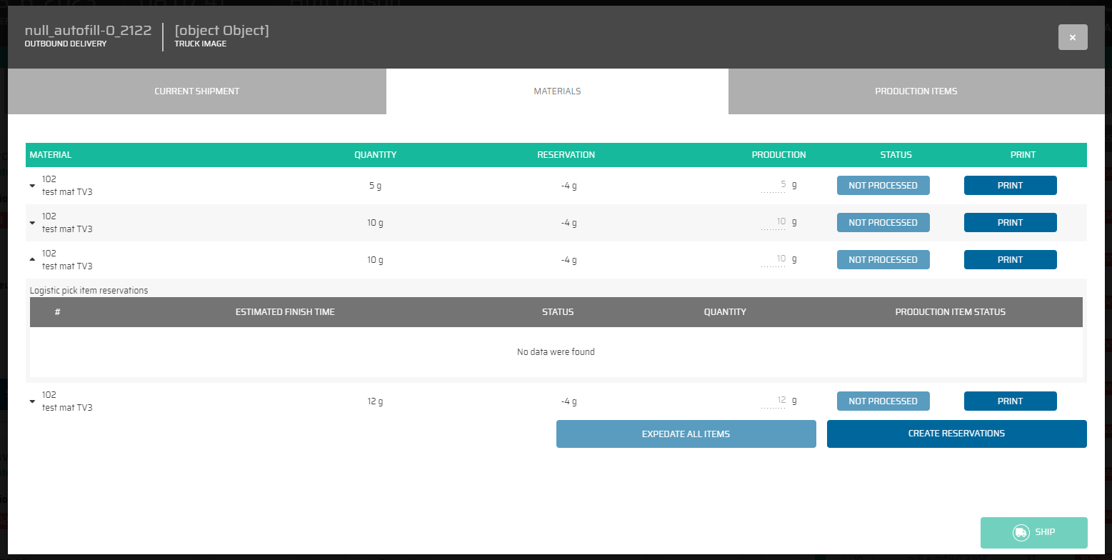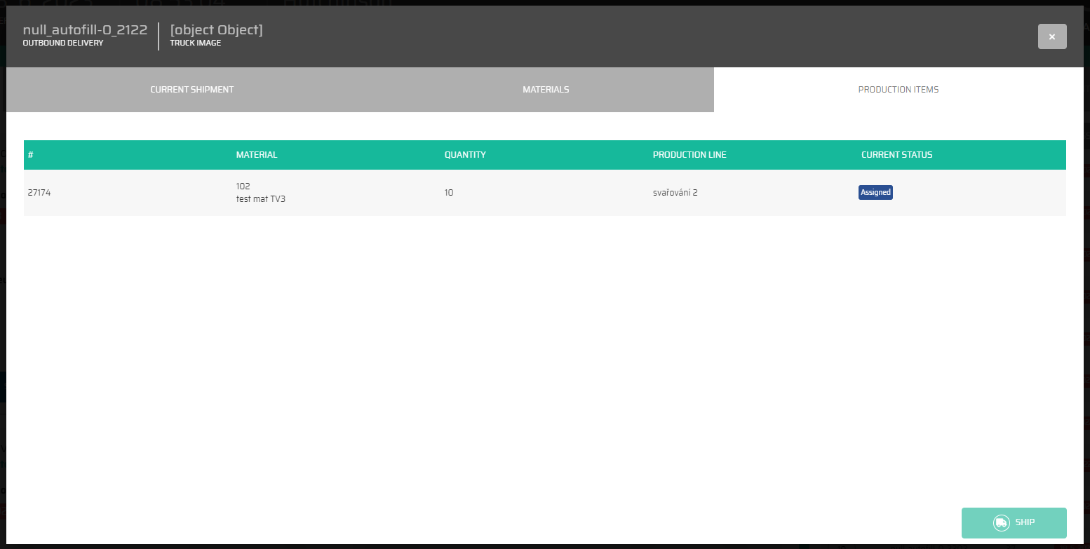 Each unassigned shipment include a list of the produciton items which are send in via the truck image. These information are displayed in the form of table, by following paramteres: