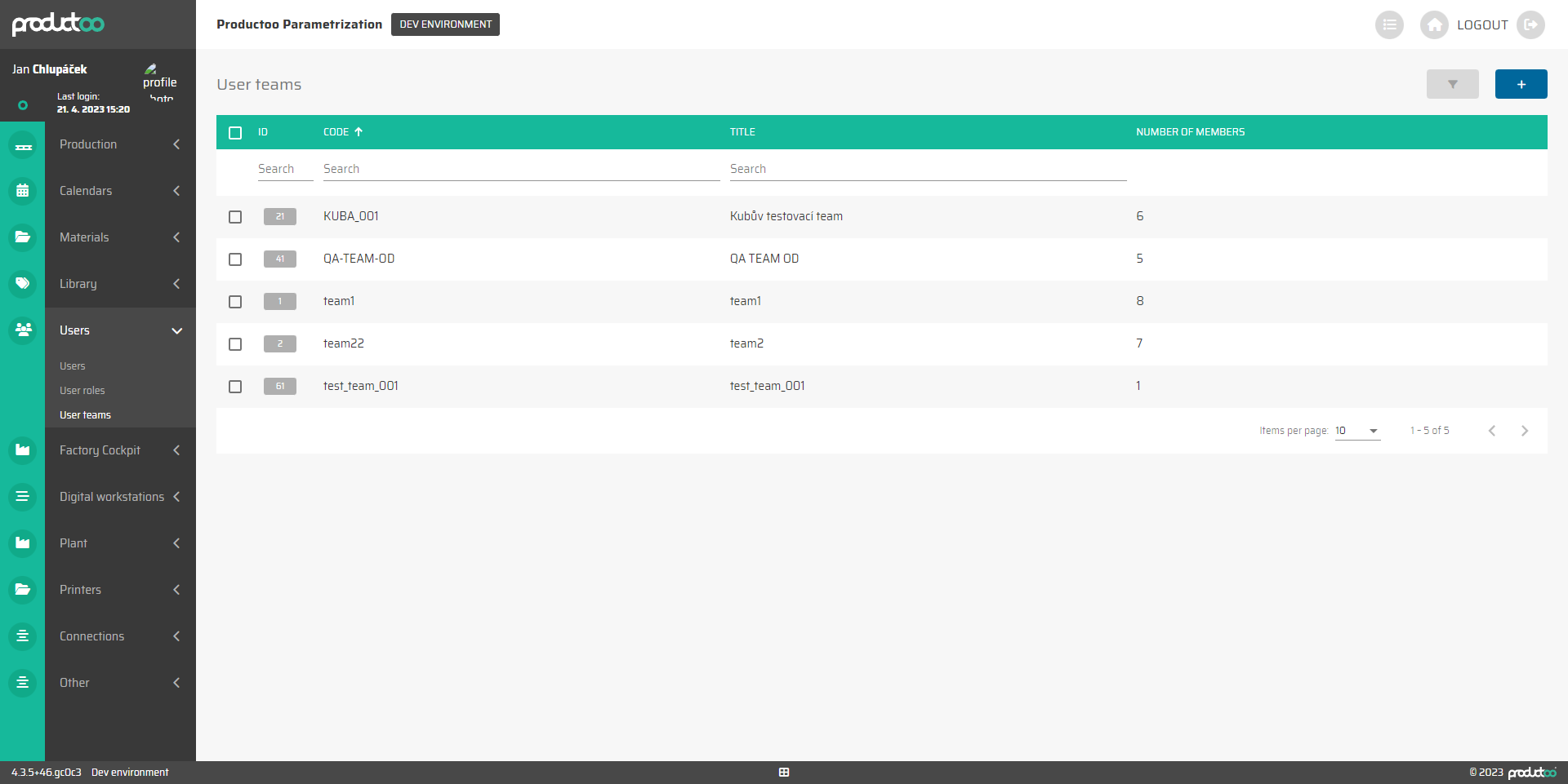Tato záložka zobrazuje všechny týmy uživatelů vytvořené v rámci aplikace P4 a umožňuje nám vytvářet, upravovat nebo mazat týmy uživatelů. Seznam Uživatelských týmů lze filtrovat podle všech zobrazených sloupců, tedy podle: