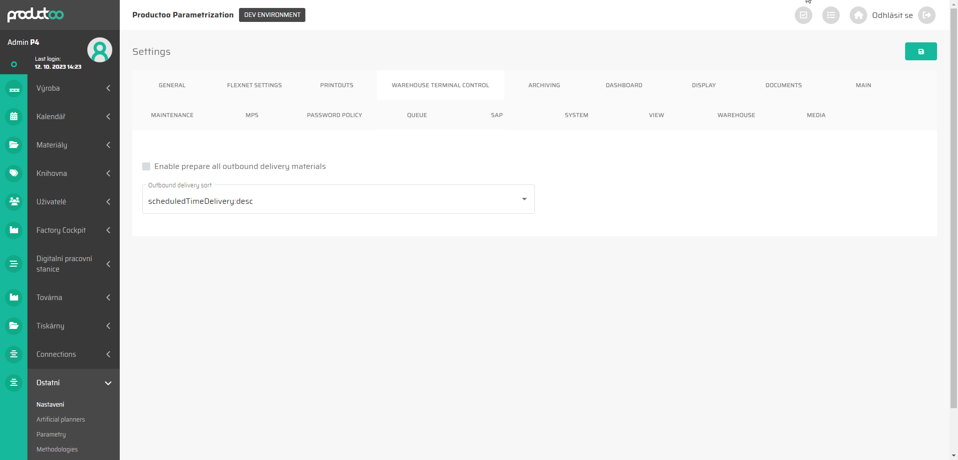 Enable prepare all outbound delivery materials | Checkbox | Zapnuto/vypnuto | Povoluje/zakázat přípravu veškerého materiálu pro odchozí dodávku ve druhé úrovni oddílu. |
