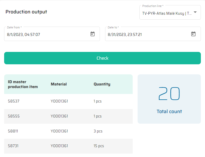 Once you input the desired filter values, the widget will show you a list of master orders that could be completed thanks to the production on the chosen line during the selected period. This means the widget does not track specific products but rather master orders and the quantity of material needed to complete them.