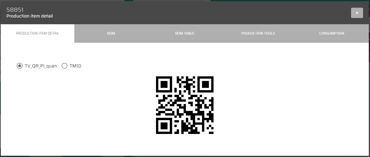 Production Item Detail | User role / Modules / Shopfloor View / Production item dialog / “Production item details” | Production Item Barcodes Parametrization: