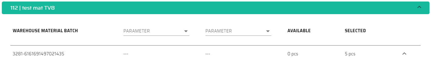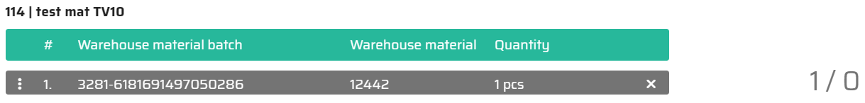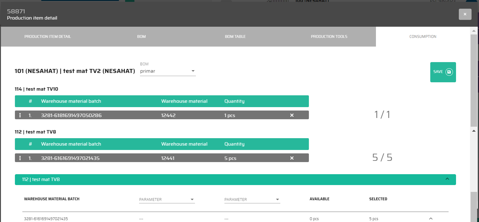 Consumption | User role / Modules / Shopfloor View / Production item dialog / “Consumption” | Production item - Consumption (receipe) - Warehouse materials |