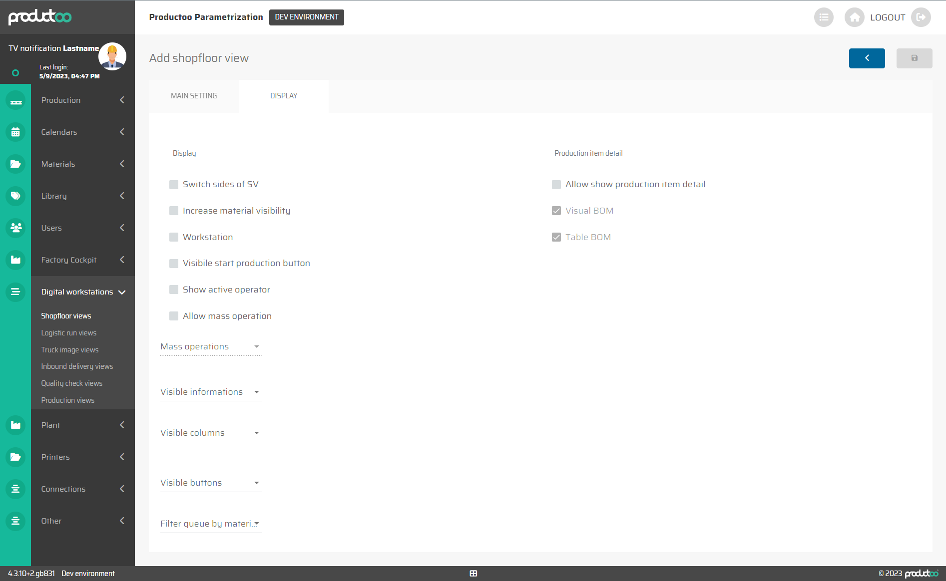 Visibile start production button | checkbox | on / off | Activates/deactivates the main button for starting production. |