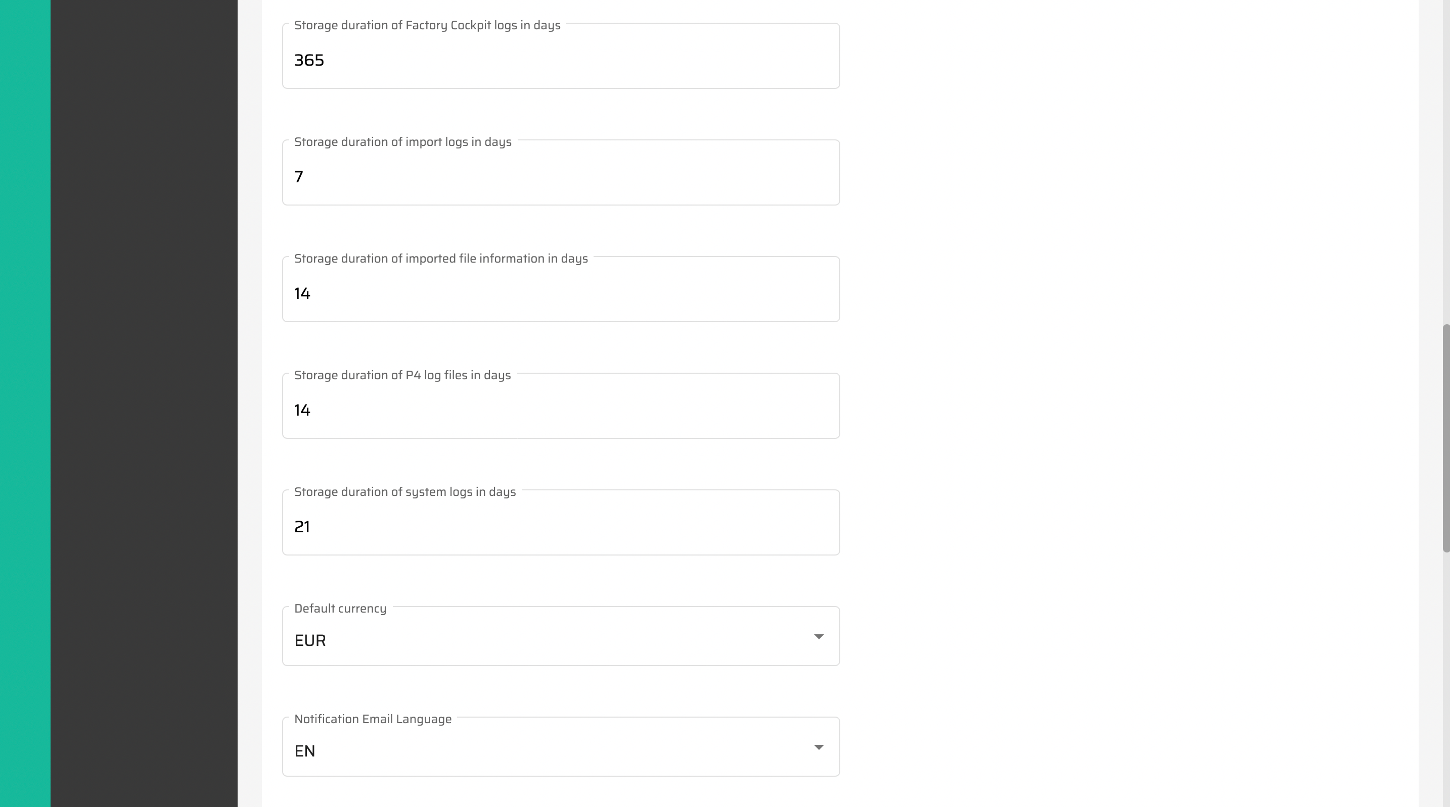 Storage duration of Factory Cockpit logs in days | 0 or positive number | Number | |