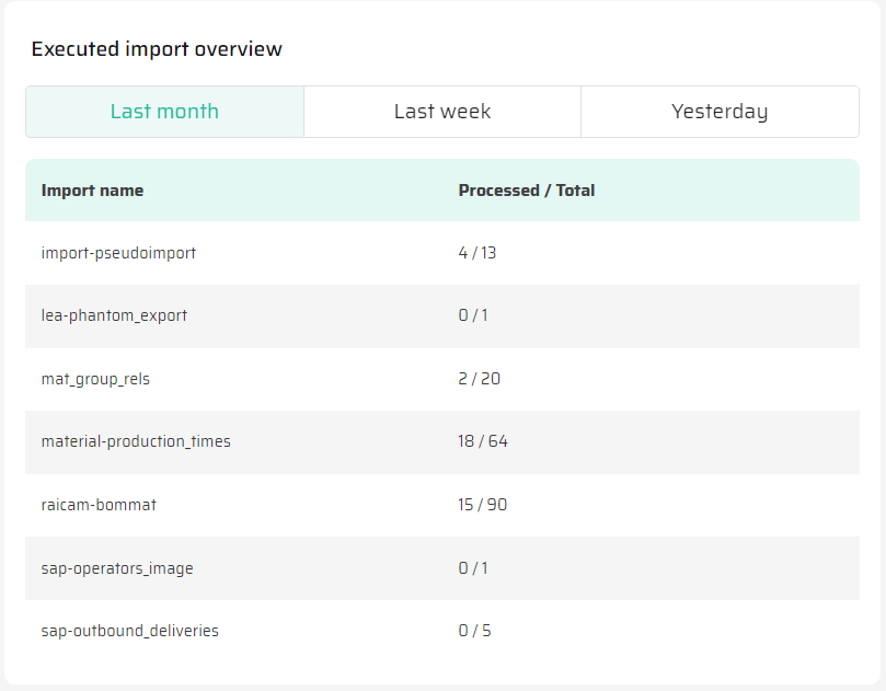 The "Overview of Completed Imports" widget serves as a valuable tool for monitoring and assessing the performance of data imports. It allows you to: