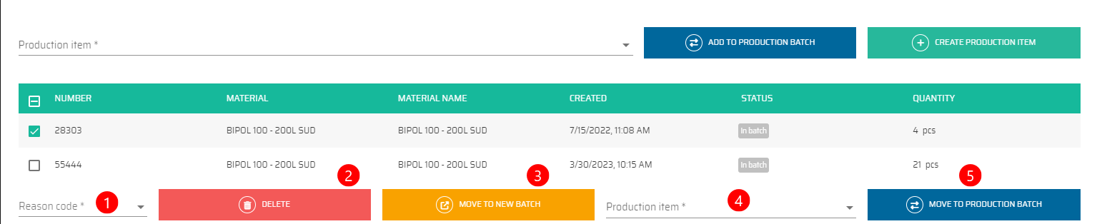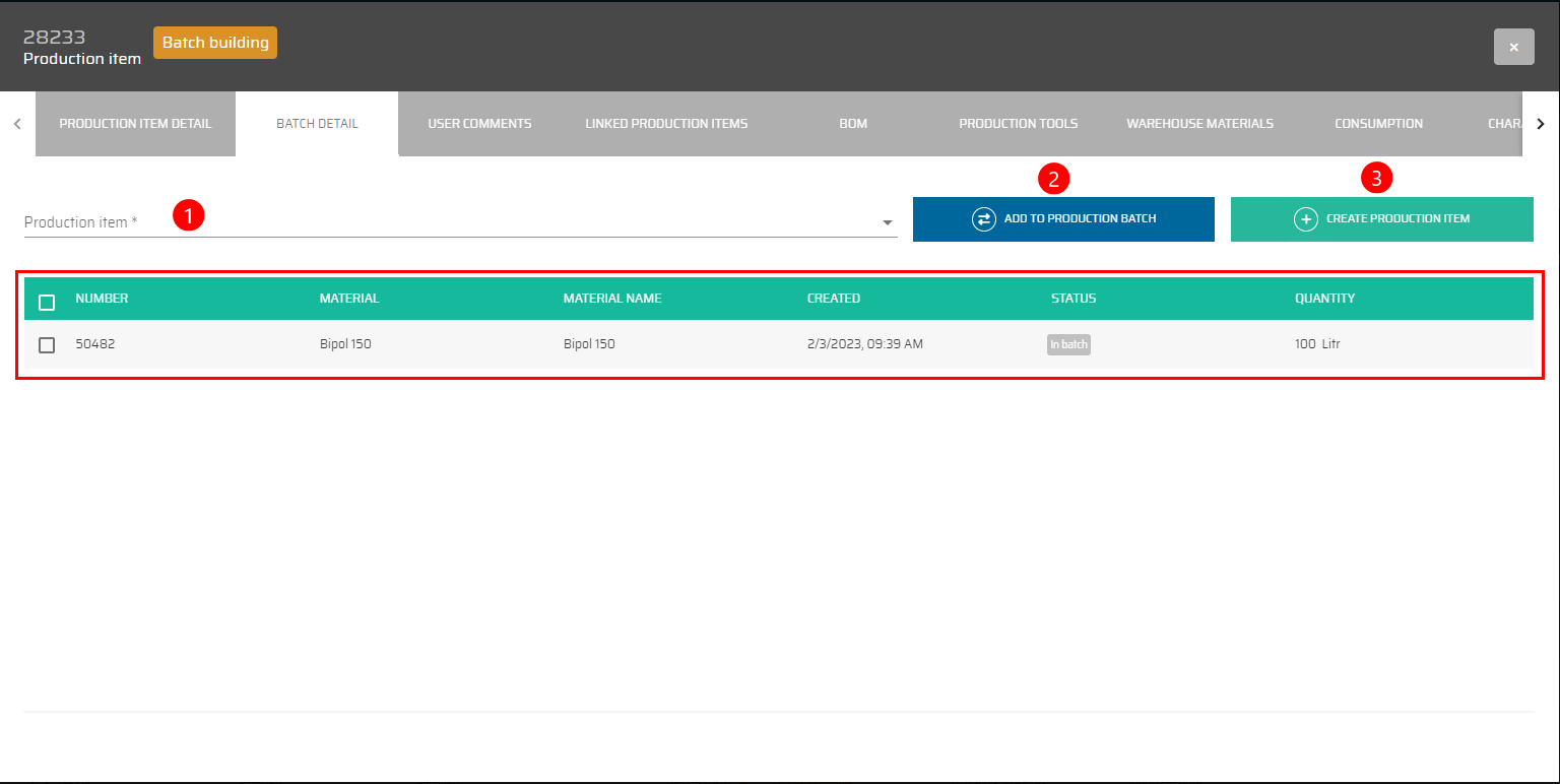 1 | Material* | Define value | The list of all available materials for the selection. | Material from which I want to create a batch. |