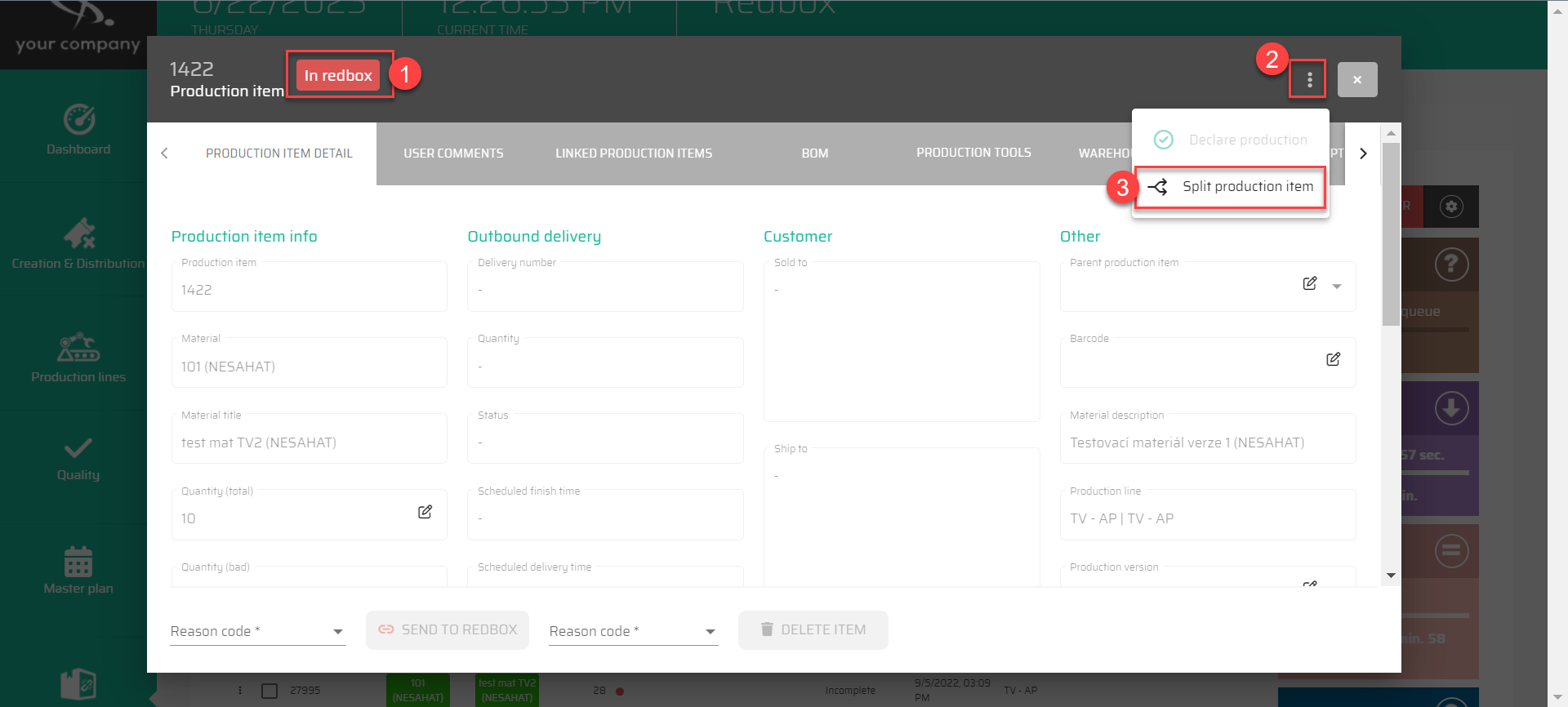 If no quantities have been declared yet, the Production Item will be split equally into 2 and both will still be in the redbox.