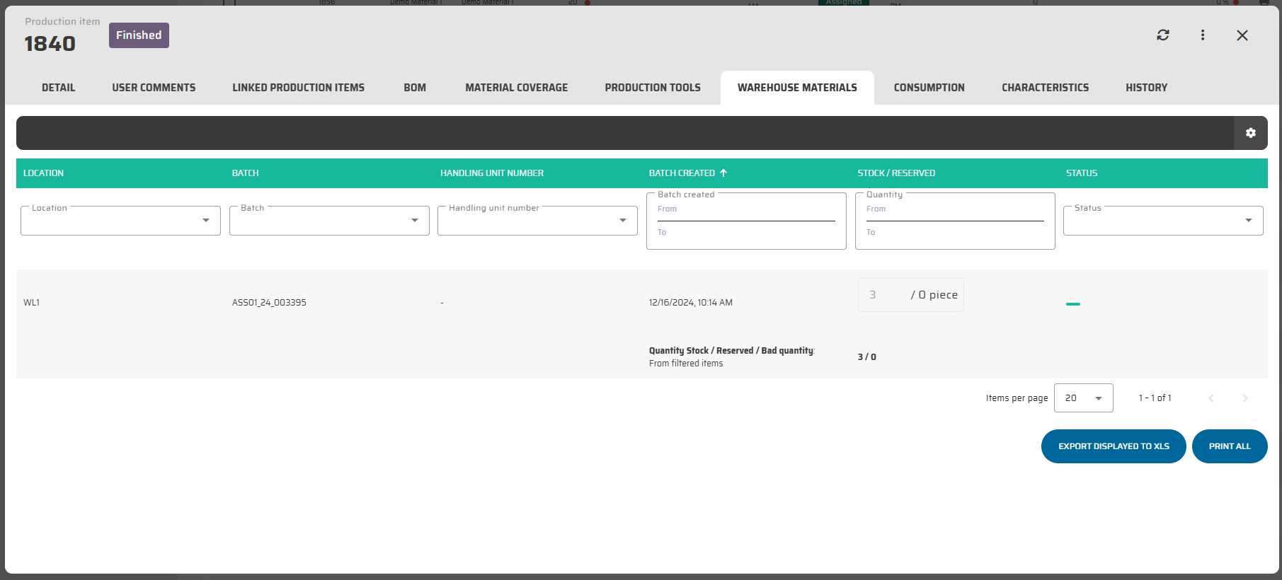 All properties of the Production Item are preserved, including the BOM. If this Production Item has linked sub-Production Items under it according to the BOM, these sub-items are also divided proportionally.
