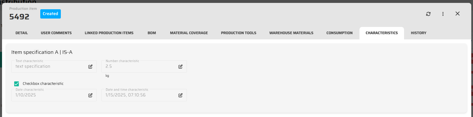 Characteristic is a universal value that is attached to some item and can be also shared with other entities. For example Material Characteristic can be automatically duplicated to its Production Item characteristics during its creation to provide operators and other users with some additional data general for this material, and simultaneously some characteristics can be specific to this Production Item.