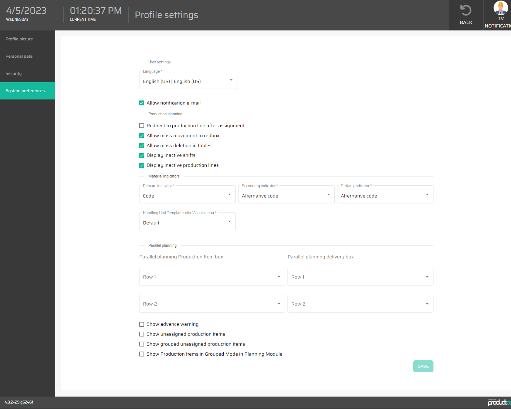 Display inactive shifts | checkbox | on / off | Even deactivated shifts are displayed to the user in the planning of the production line. |