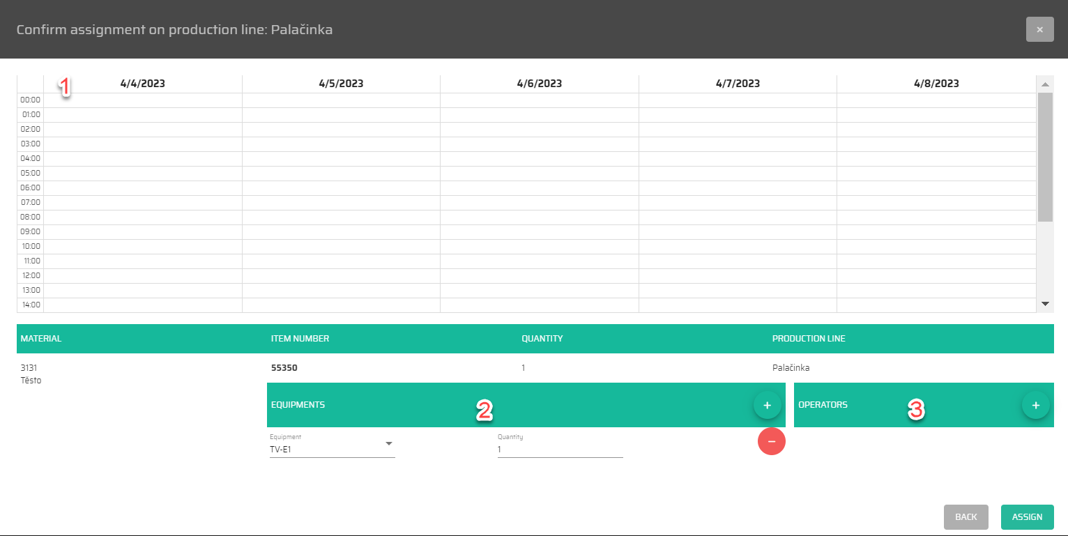 This type of assign dialog is the most complex one and contains the preview of the production queue.